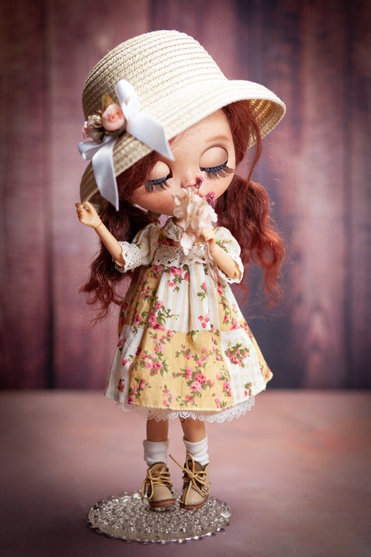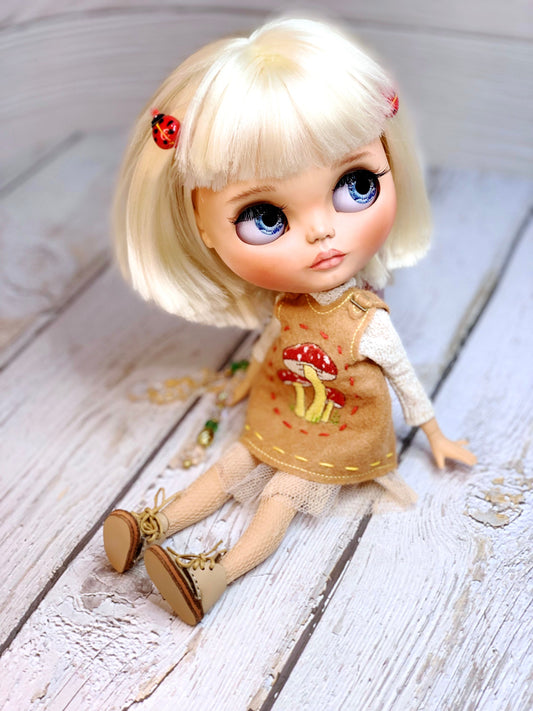 Blythe Doll Kleid. Puppenkleid mit Stickerei. Unterrock im vintage Stil. Outfit in beige mit Pilz Stickerei