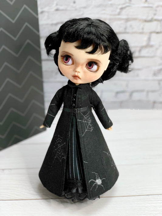 Blythe Doll Mantel schwarz Gothic. Puppenmantel mit Spinnen Stickerei. Puppenkleidung.