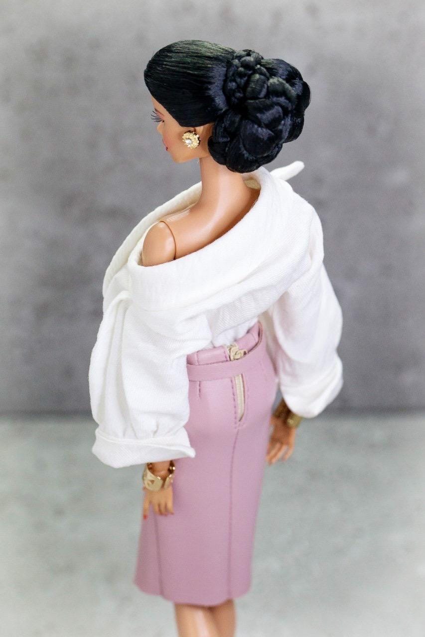 Dieses stilvolle Ensemble, bestehend aus einem seidigen Body in Elfenbein und einem altrosafarbenen Rock aus Kunstleder, verleiht Ihrer Puppe einen zeitlosen und luxuriösen Look. Der Body ist aus weichem, edlem Stoff gefertigt und bietet einen eleganten, fließenden Sitz. Der Rock besticht durch einen langen Schlitz vorne und wird hinten mit einem praktischen Reißverschluss geschlossen.