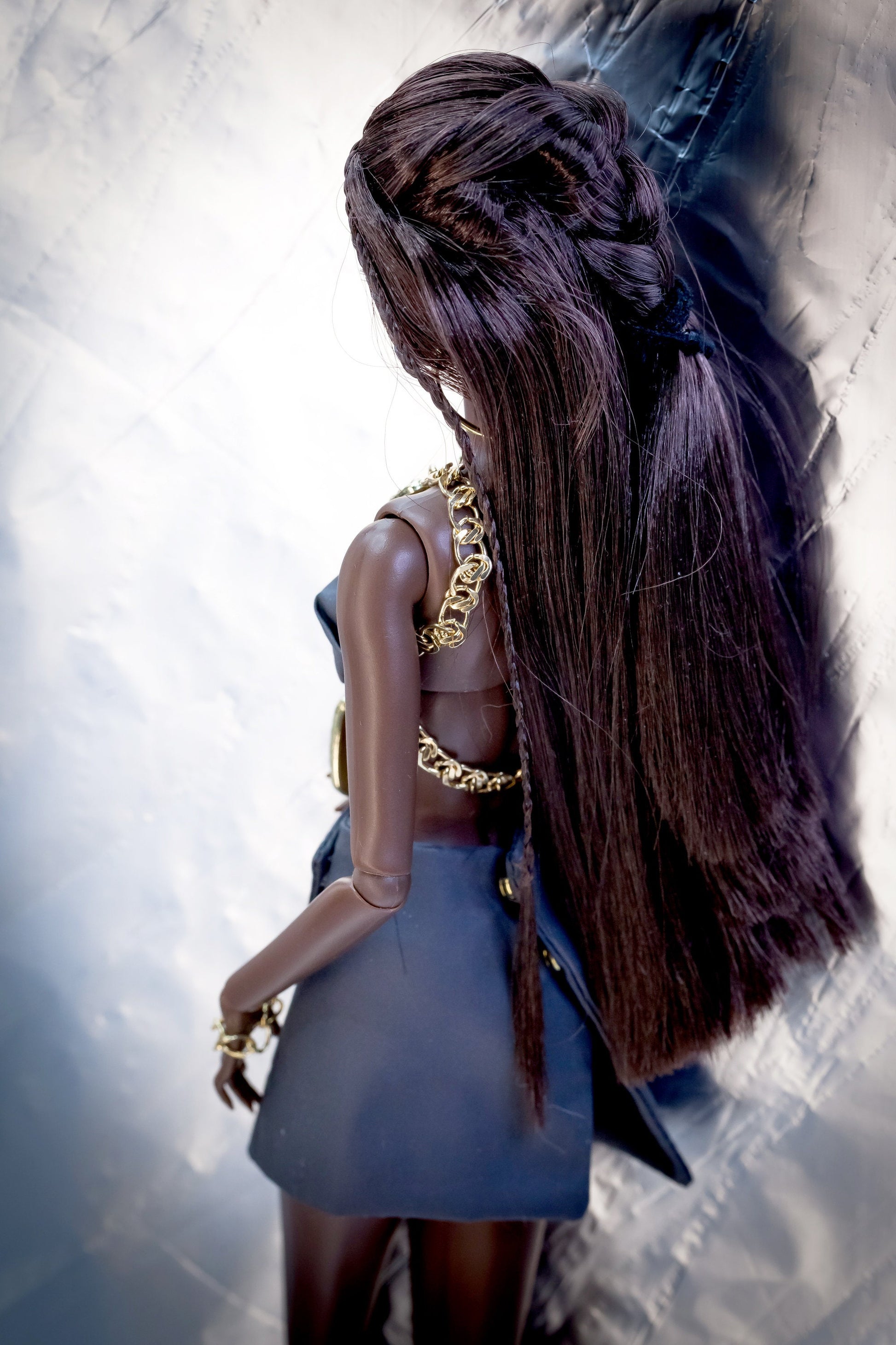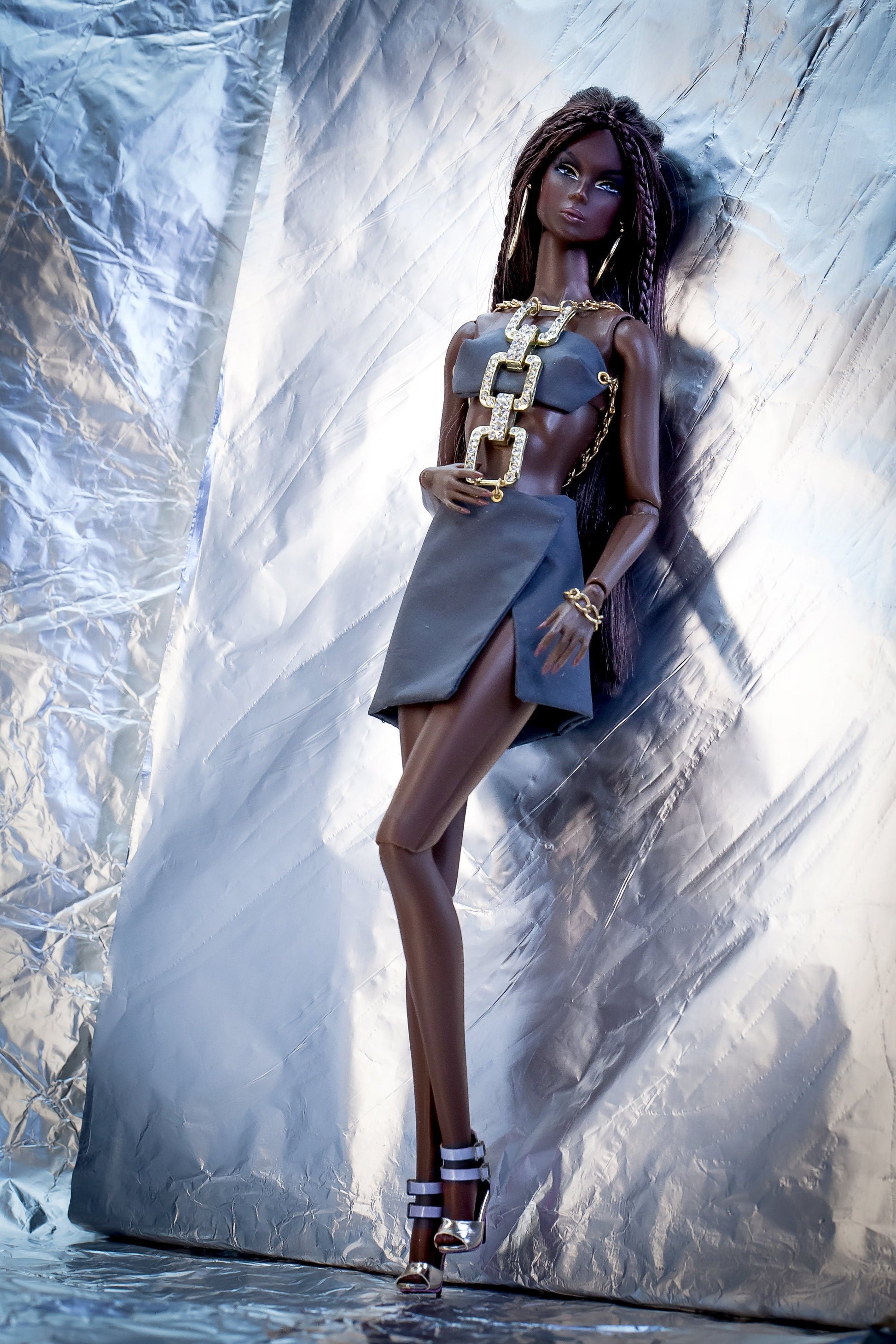 Dieses exklusive Cocktail-Minikleid ist ein wahres Sammlerstück für Puppenliebhaber und passt für Poppy Parker, Nu Face und Fashion Royalty Puppen. Die handgefertigte Kreation mit filigranen Kettenverzierungen und Folienstoff ist auf nur zwei Exemplare limitiert und vereint Eleganz mit modernem Stil.