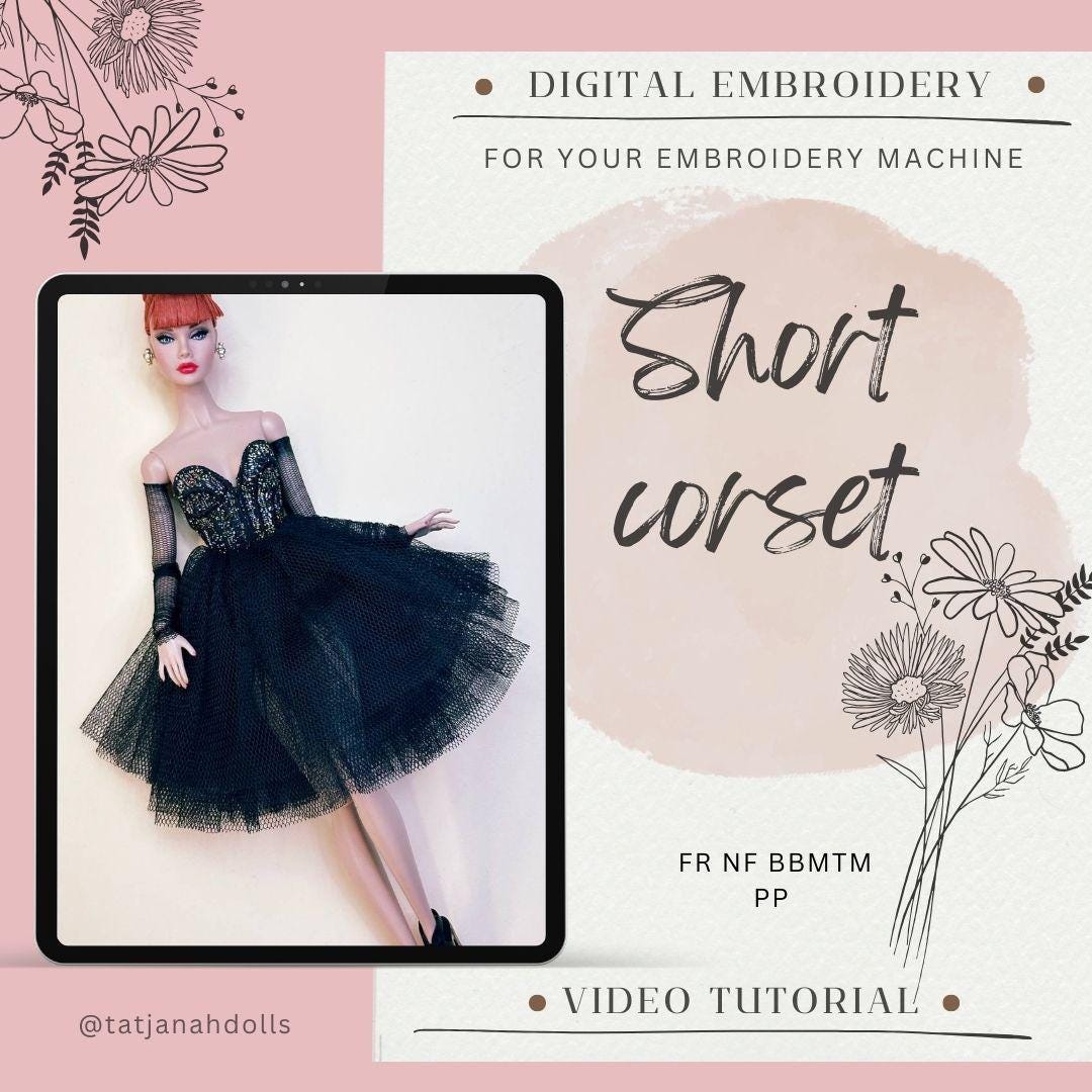 Design and create a stylish short corset or dresses for your dolls with this detailed embroidery file. Dress sewing tutorial included. Perfect for doll fashion enthusiasts and makers using embroidery machines.