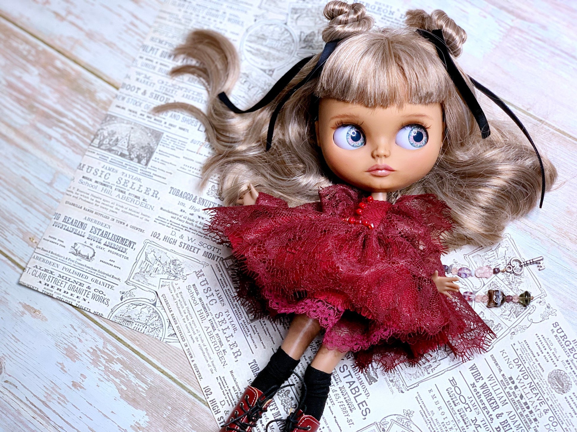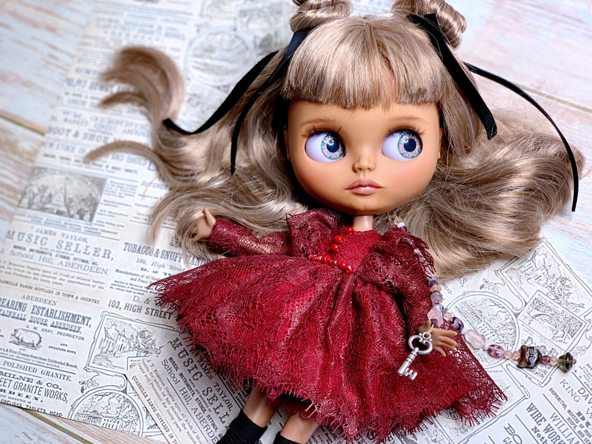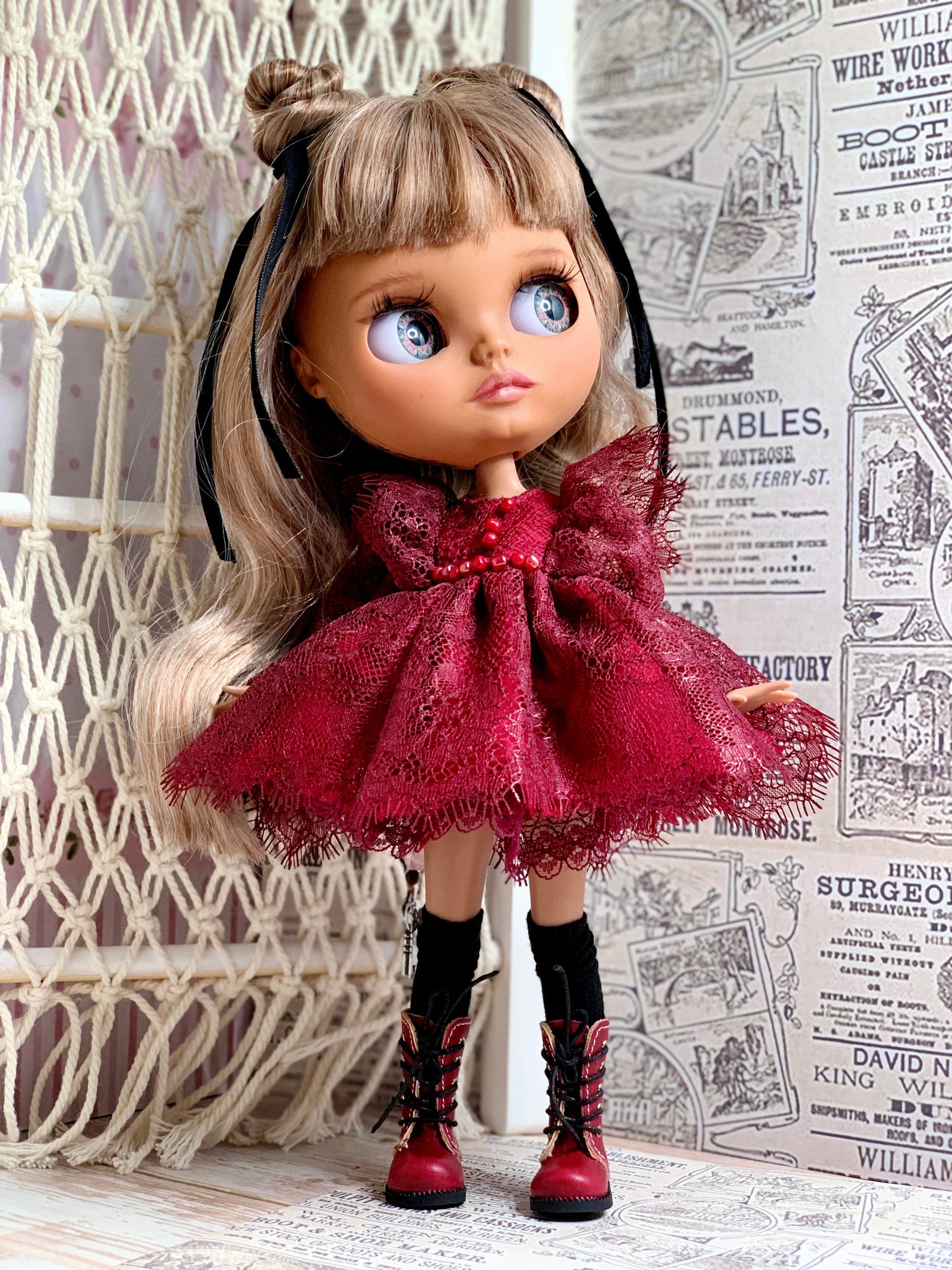 Ein edles mit Perlen besticktes dunkelrotes Kleid, Ballkleid aus Spitze, Ballkleid für Blythe Puppe ( passend auch für Pulipp und ähnliche Puppenkörper).
