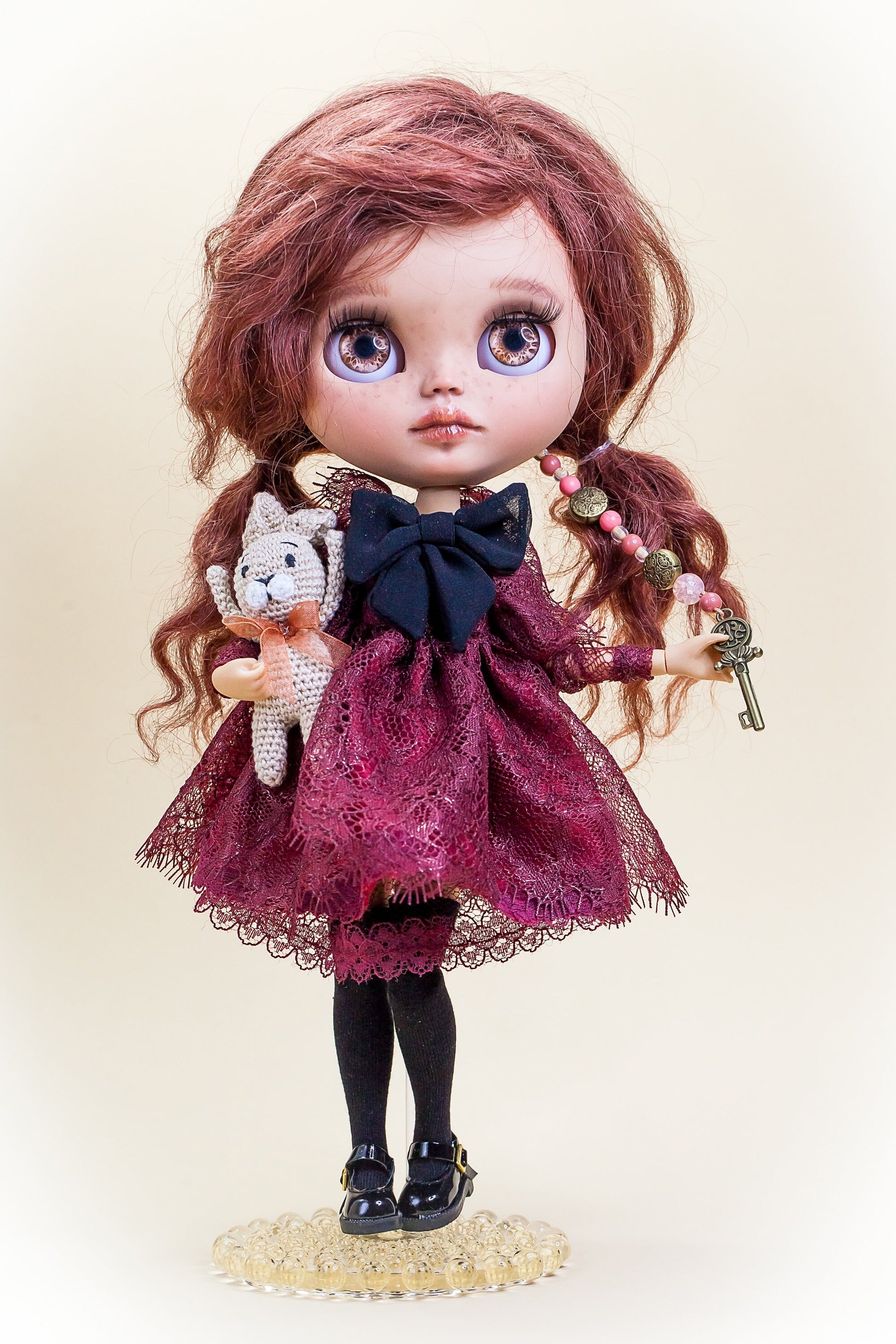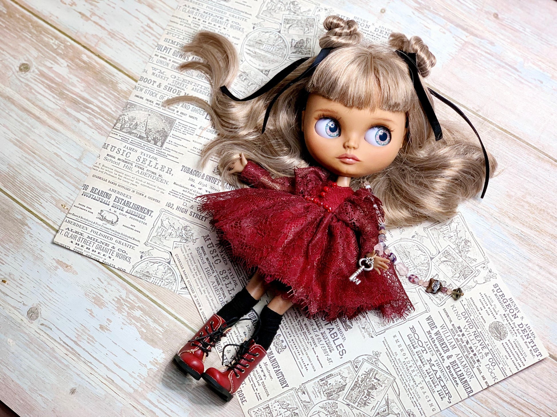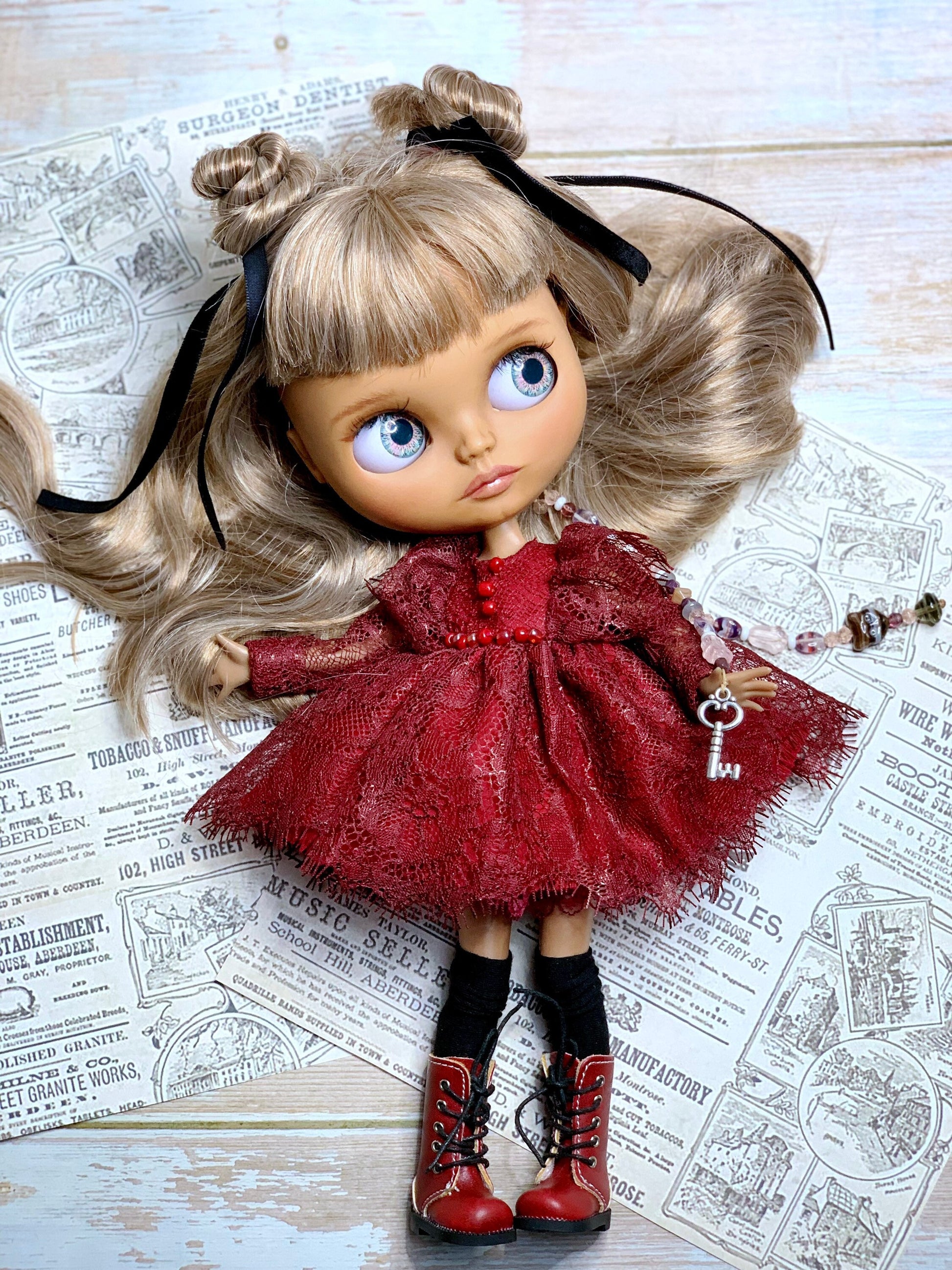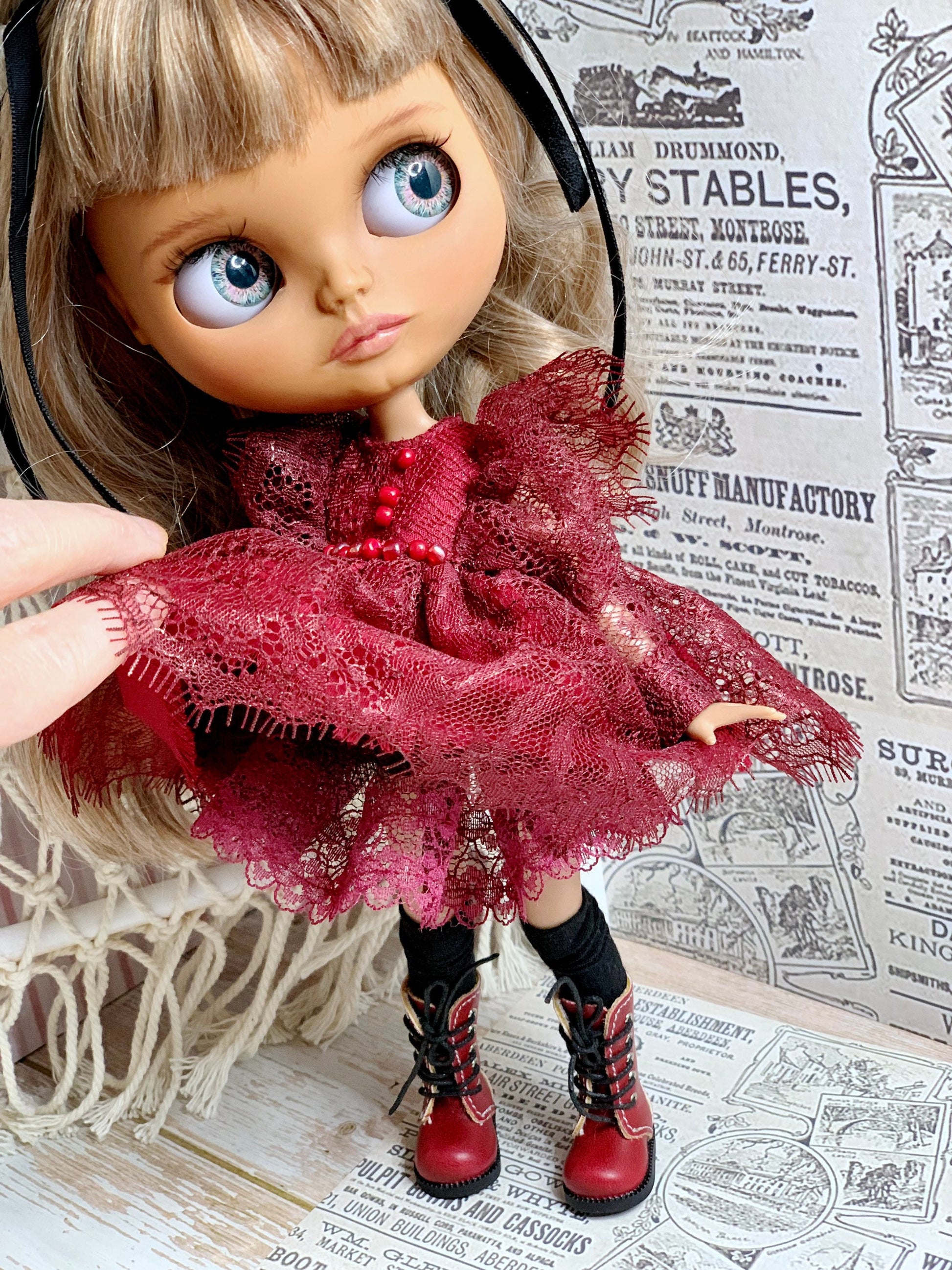 Ein edles mit Perlen besticktes dunkelrotes Kleid, Ballkleid aus Spitze, Ballkleid für Blythe Puppe ( passend auch für Pulipp und ähnliche Puppenkörper).