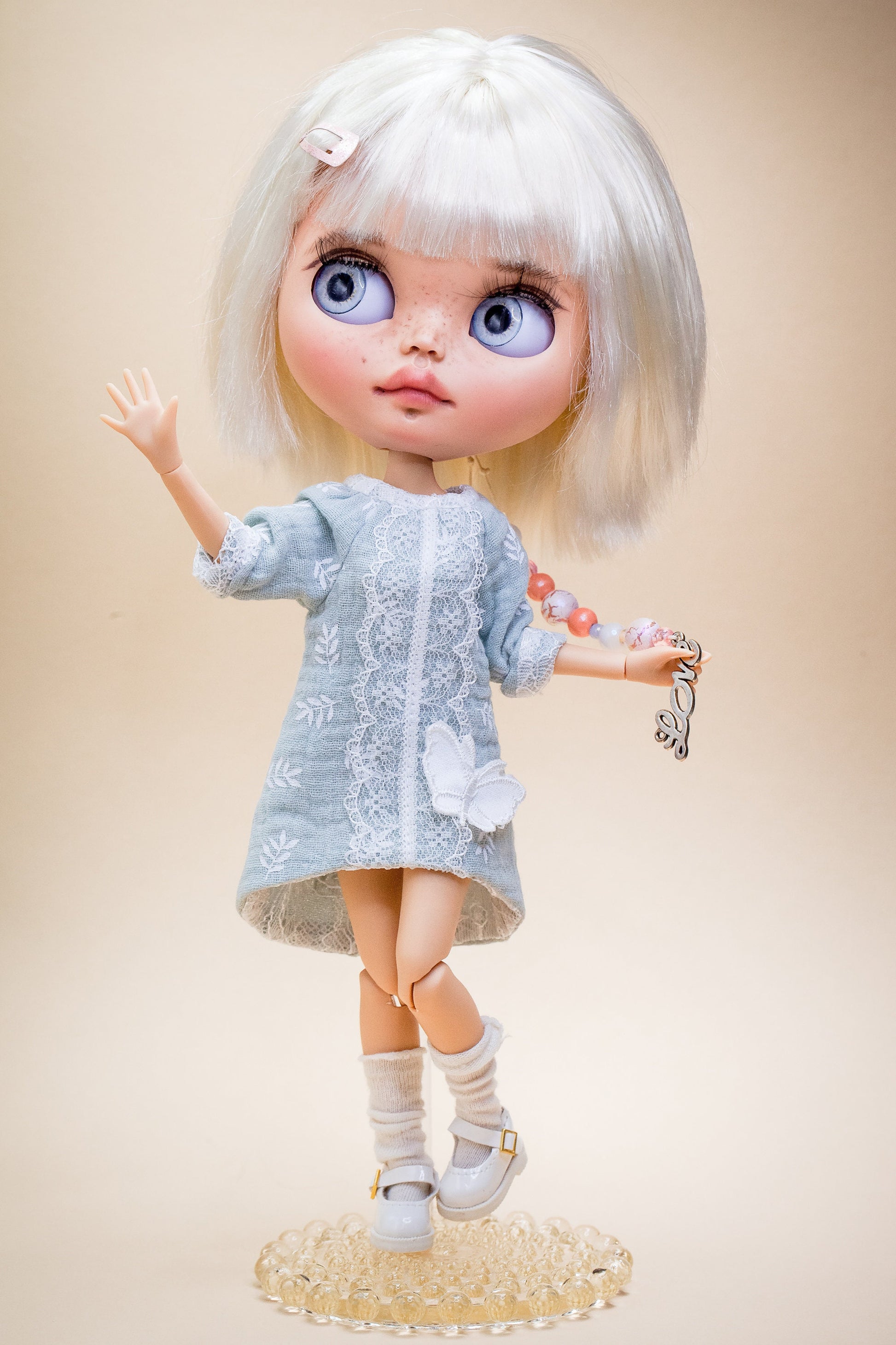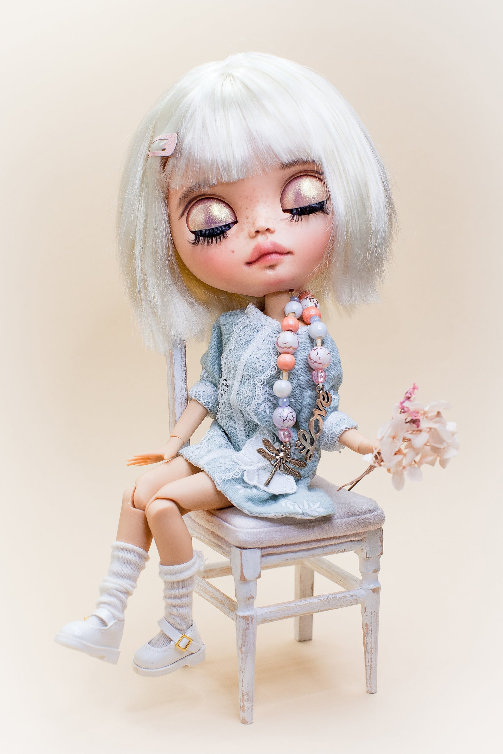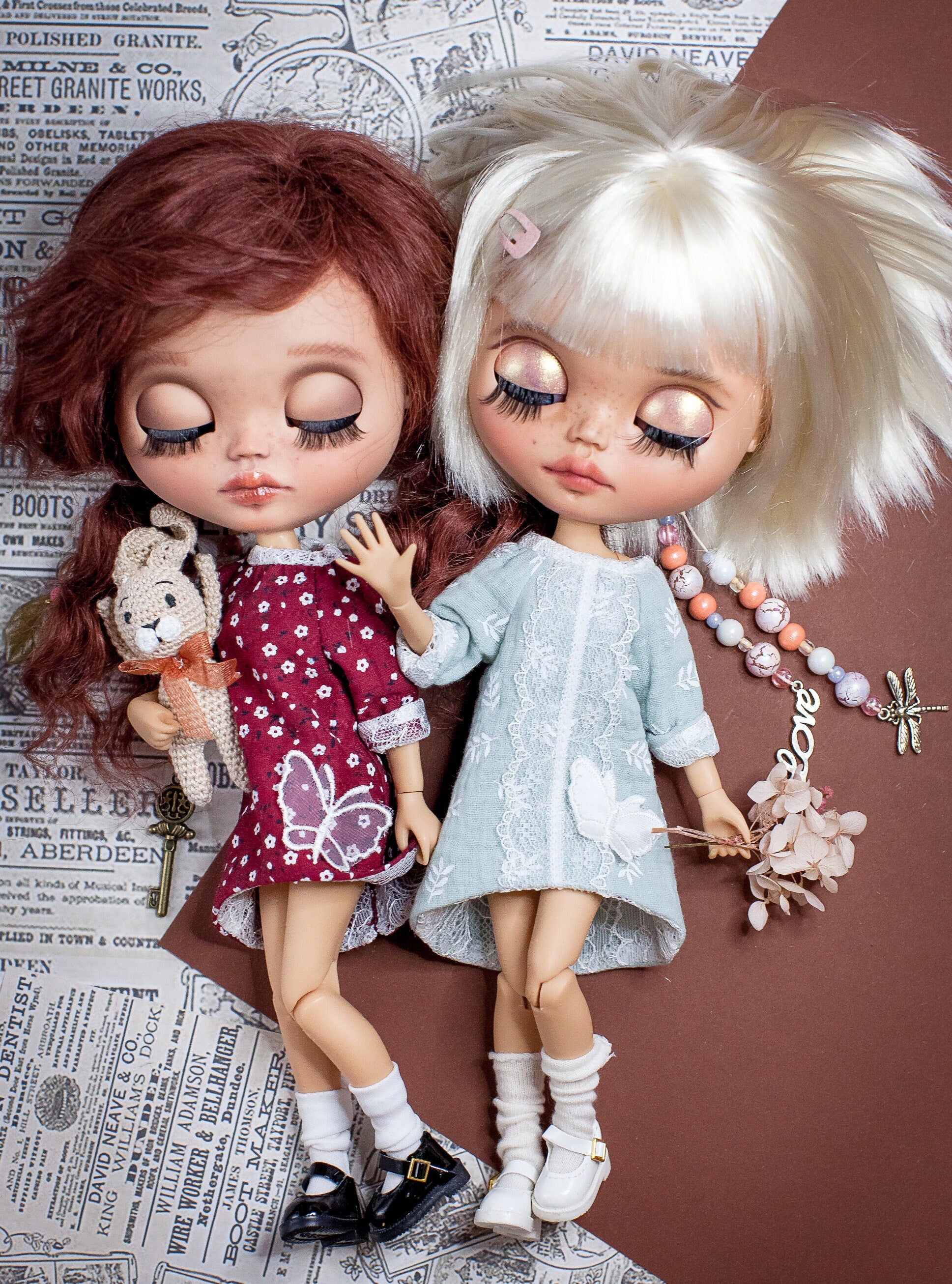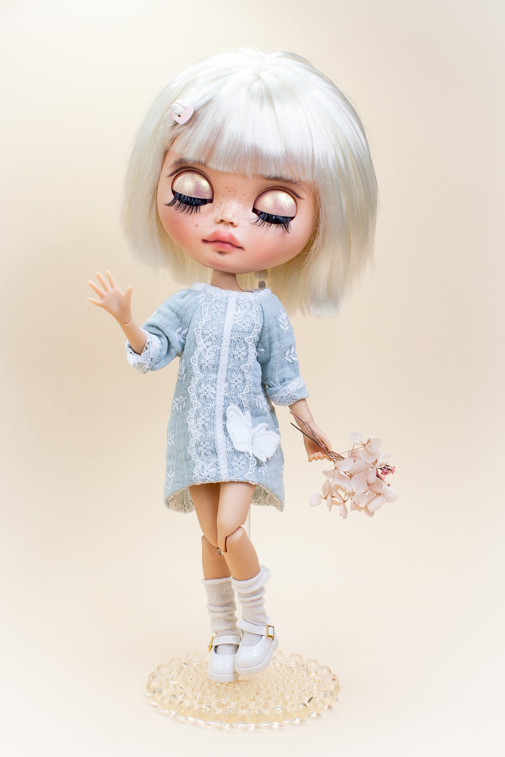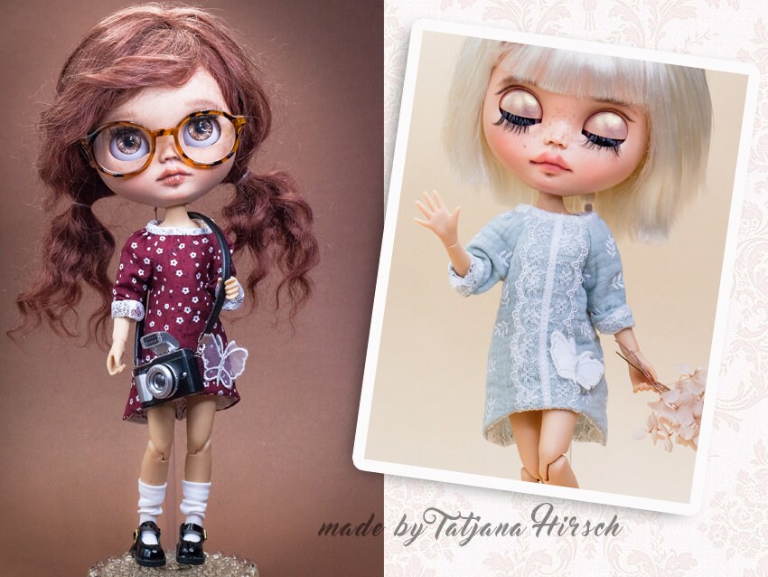 Ein einzigartiges, handgefertigtes Kleid im Fokuhila-Stil für Blythe Puppen, das mit zarter Spitze und einer liebevollen Schmetterling-Applikation verziert ist. Das Kleid ist aus hochwertigem Baumwollstoff gefertigt und bietet eine hervorragende Passform für Sammlerpuppen. Perfekt für alle, die ihren Puppen einen charmanten, romantischen Look verleihen möchten.