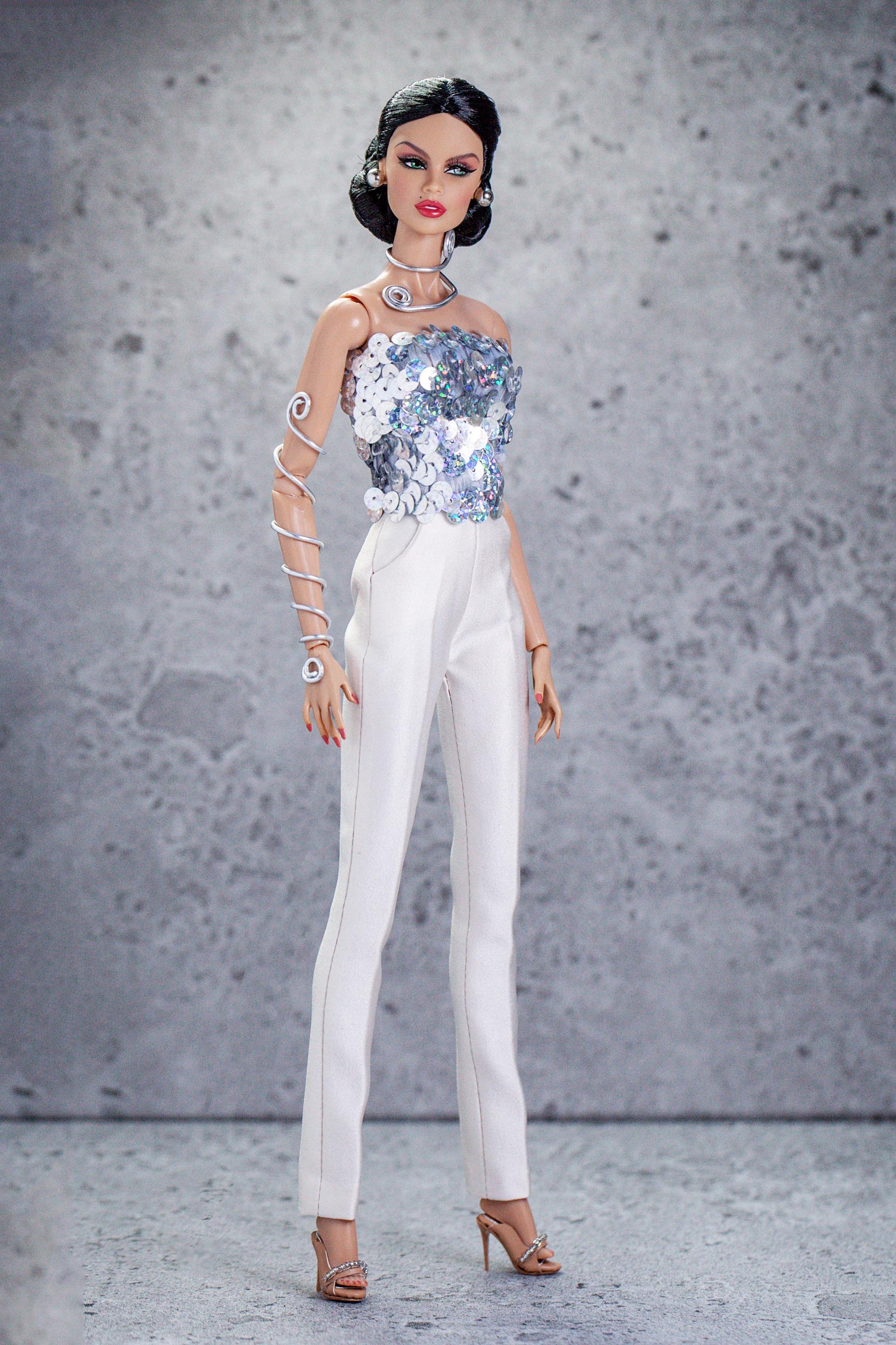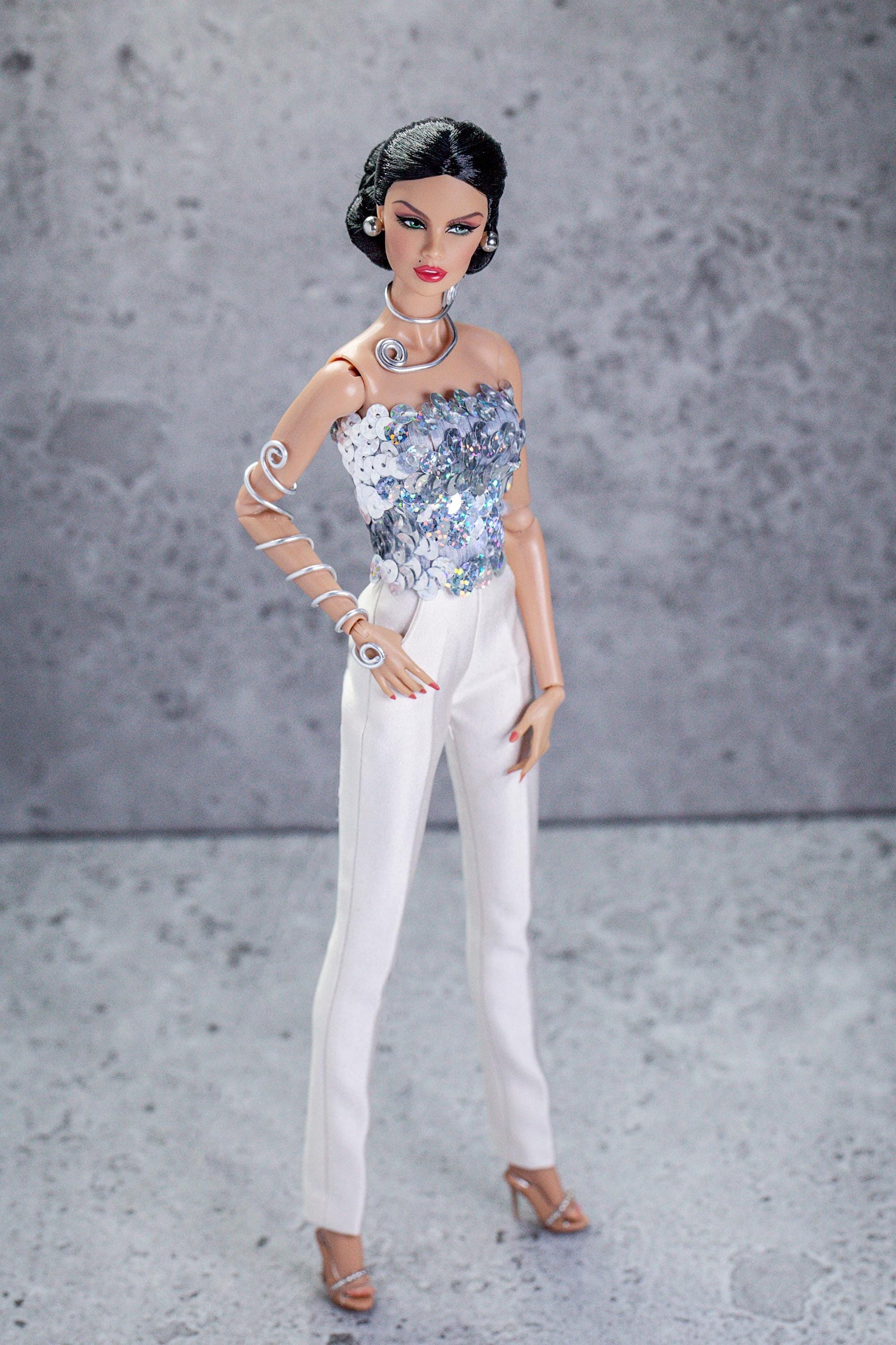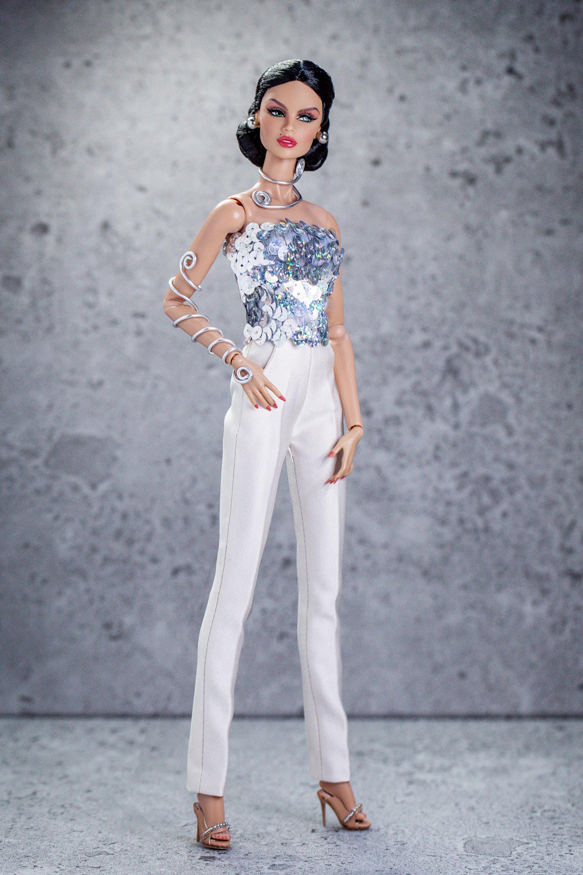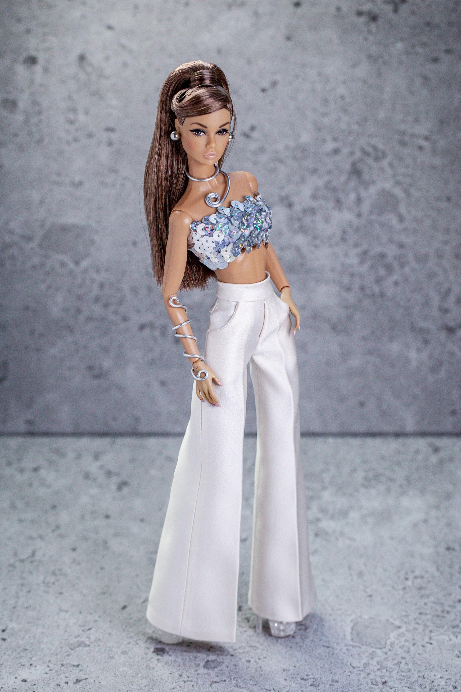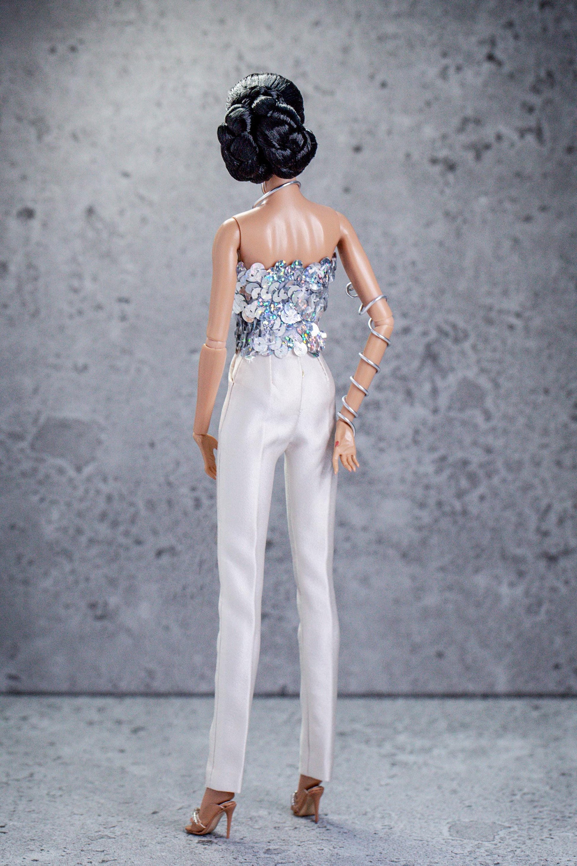 Ein atemberaubendes Ensemble für Fashion Dolls im Maßstab 1/6! Das Outfit besteht aus einer eleganten Hose in elfenbein und einem glamourösen Pailletten-Top, perfekt für besondere Anlässe oder stilvolle Fotoshootings.