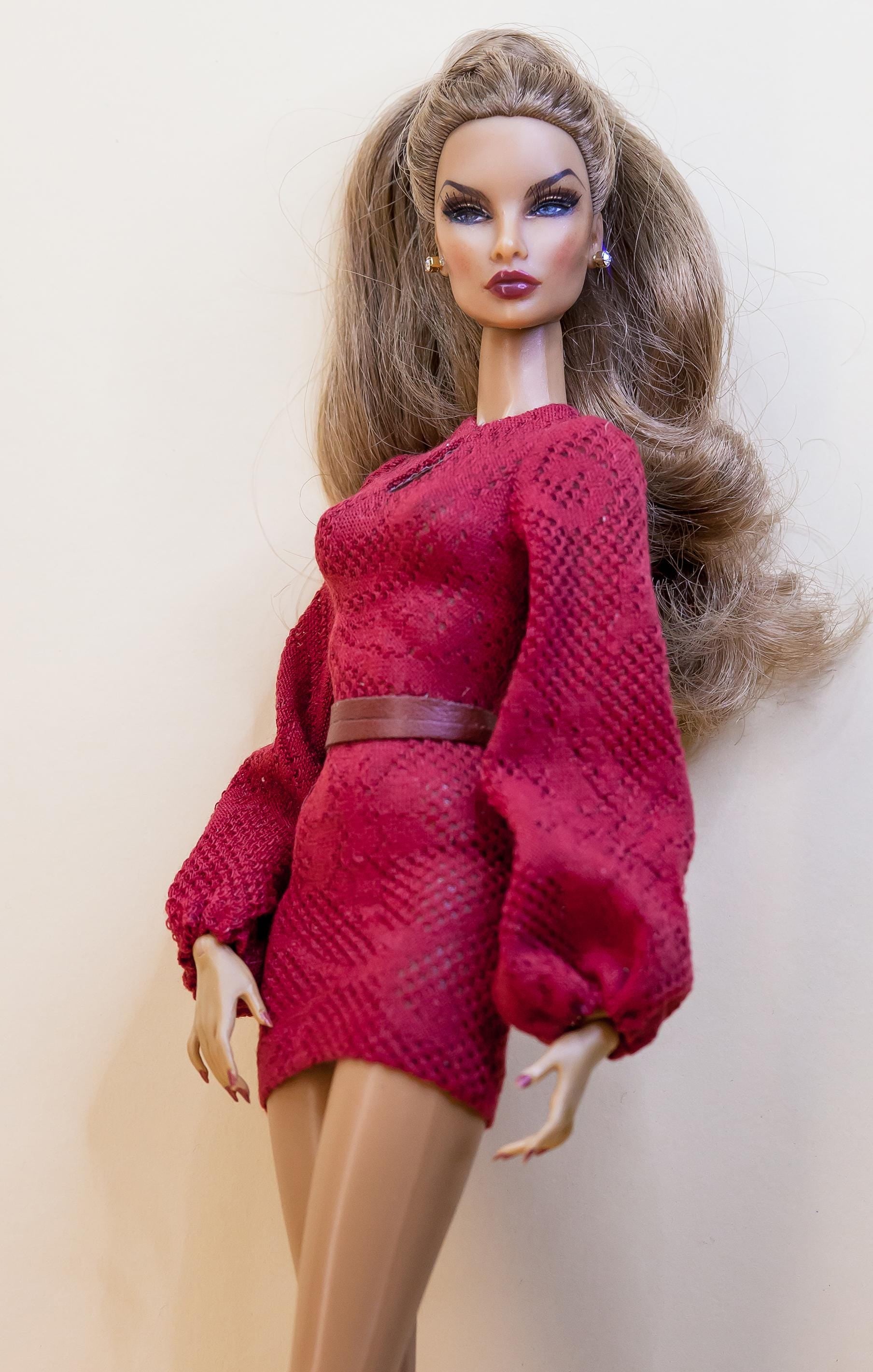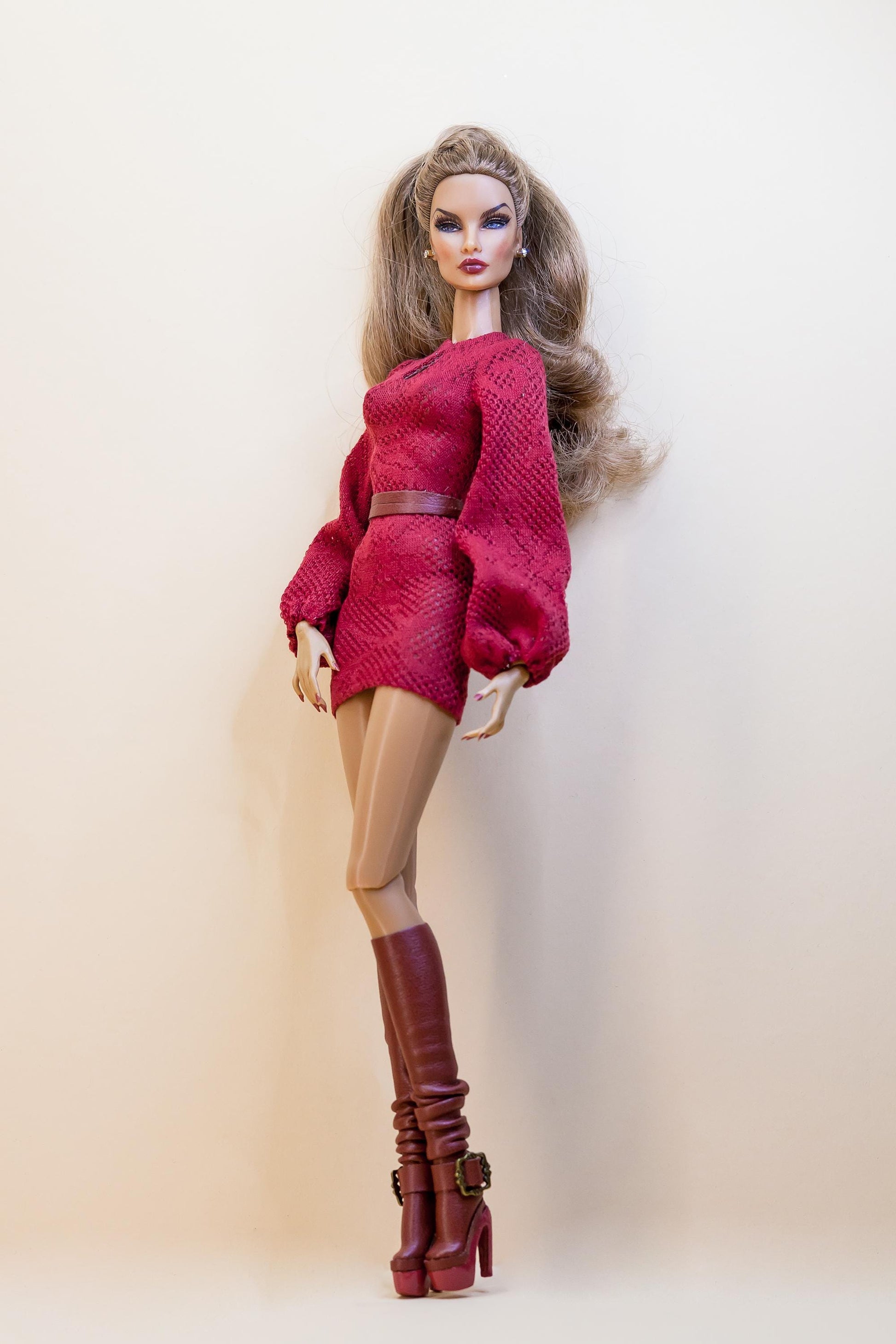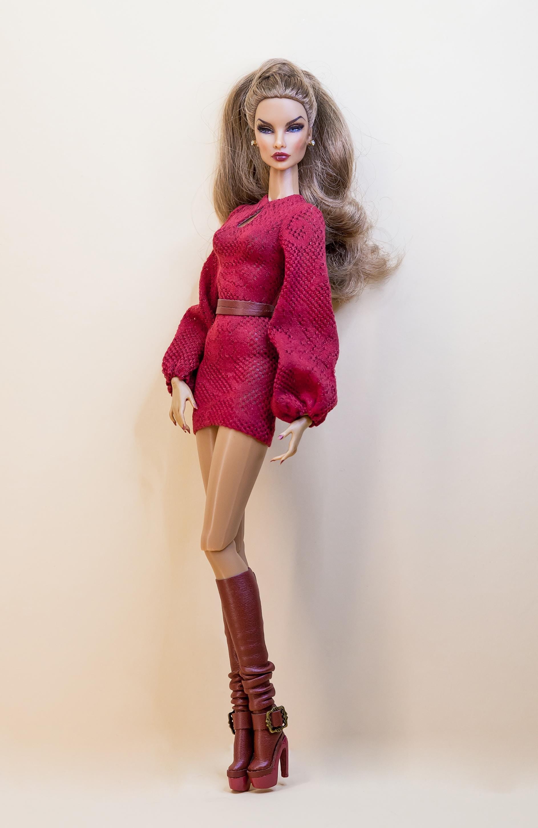 Dieses exklusive, handgefertigte Minikleid verleiht deinen Fashion Royalty-, Poppy Parker- oder Nu Face-Puppen einen stilvollen Look. Der leicht dehnbare Jersey-Stoff sorgt für eine figurbetonte Passform. Geschlossen wird das Kleid mit kleinen Knöpfen am Rücken. Ein passender Gürtel ist im Lieferumfang enthalten. Die Stiefel zum roten Kleid sind separat erhältlich.