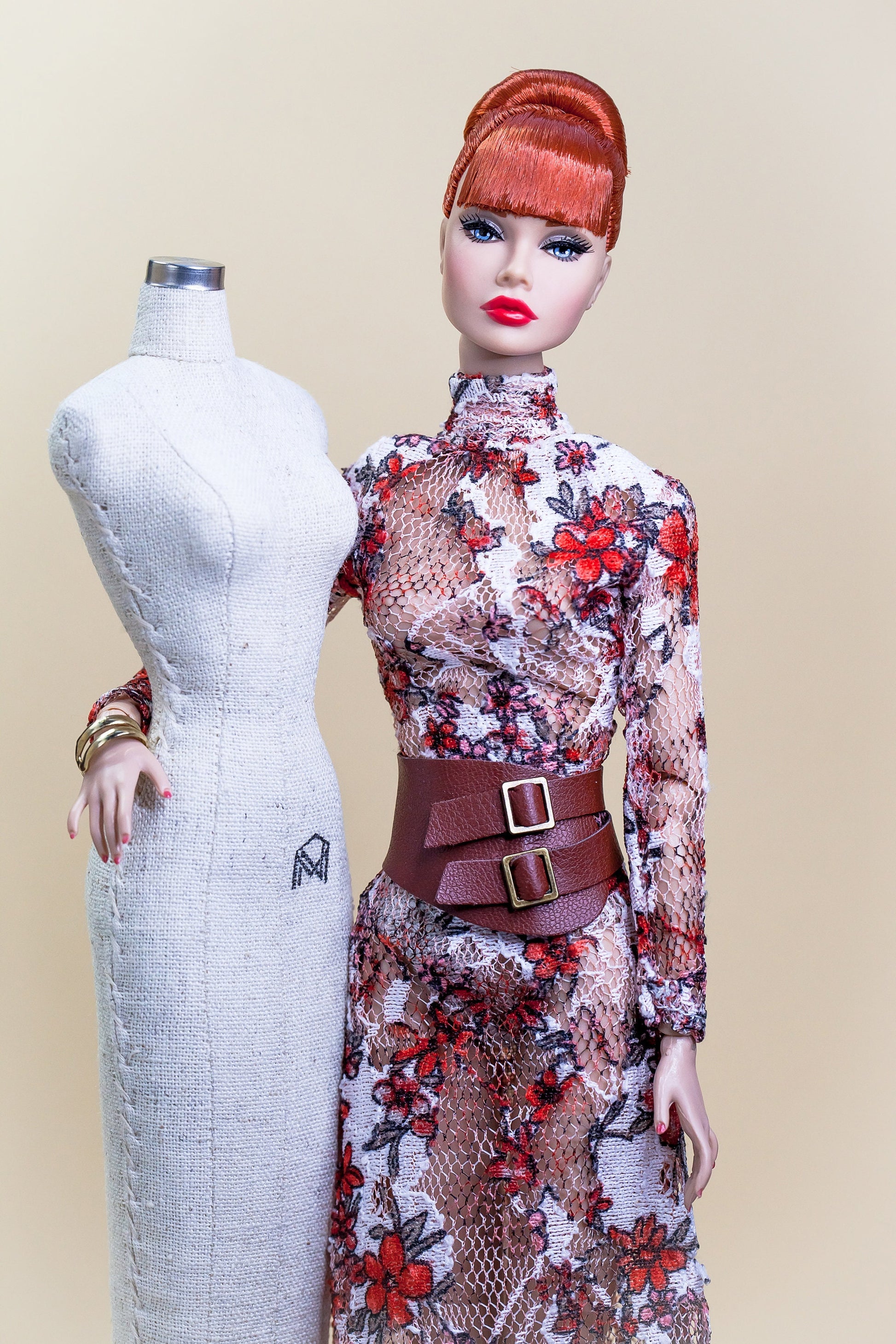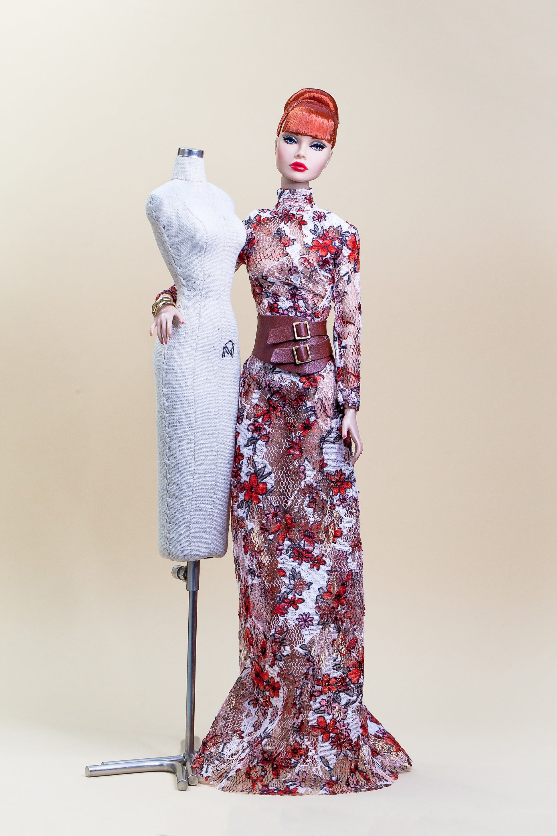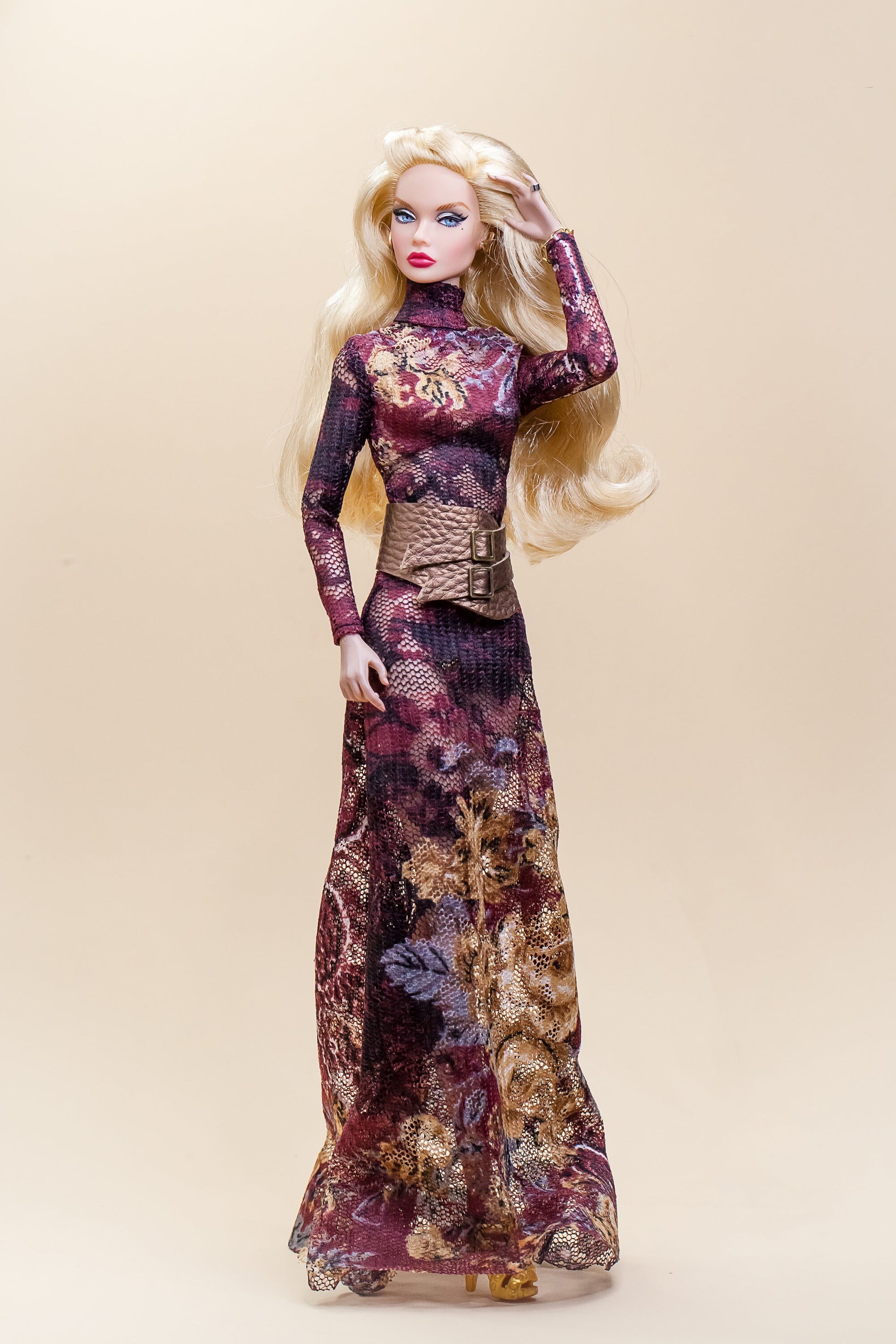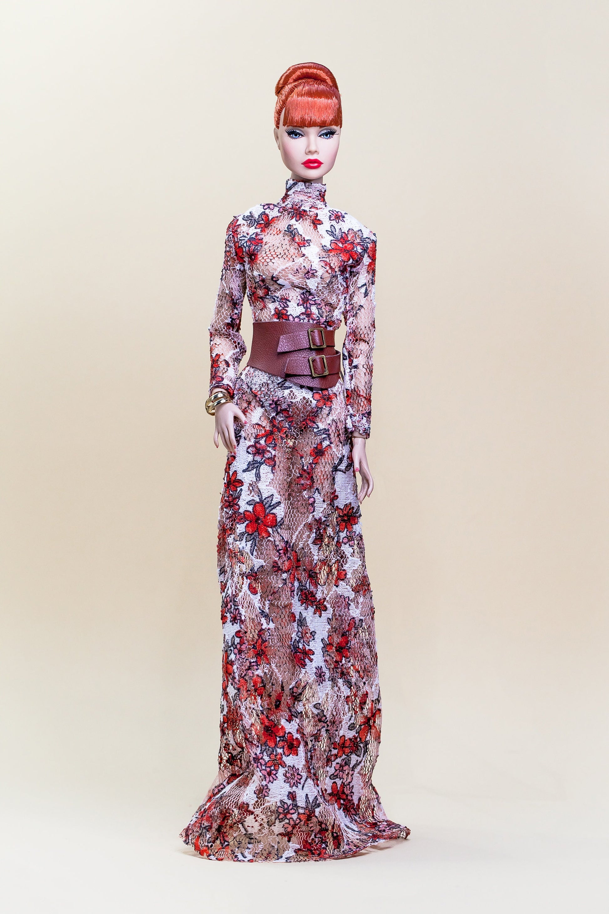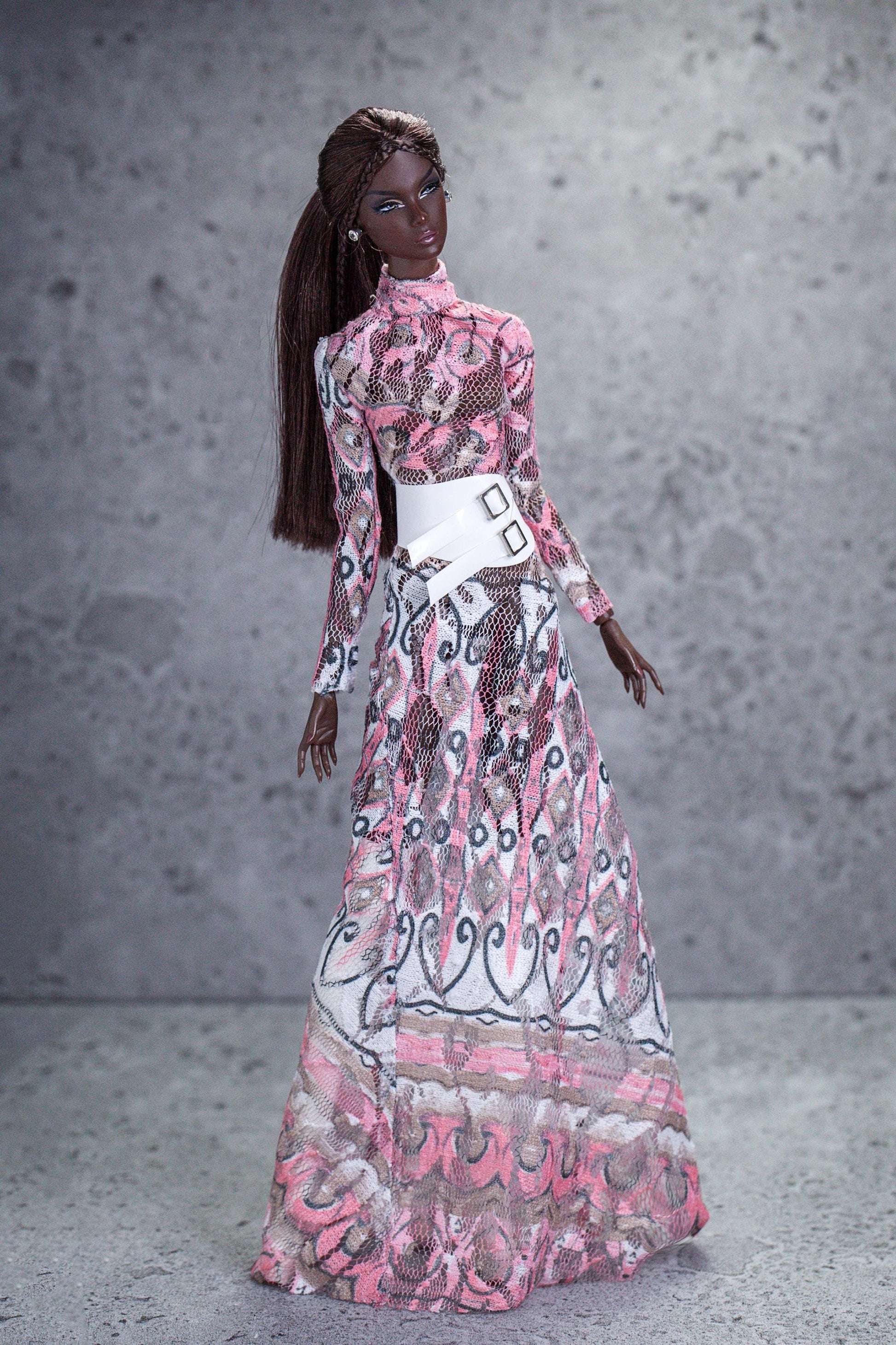 Dieses exklusive, handgefertigte Langkleid verleiht deinen Fashion Royalty-, Poppy Parker- oder Nu Face-Puppen einen stilvollen Look. Durch den leicht dehnbaren Netzstoff sitzt es perfekt am Körper und wird mit kleinen Knöpfen am Rücken geschlossen. Der passende Gürtel ist im Angebot inklusive und rundet den Look ideal ab.