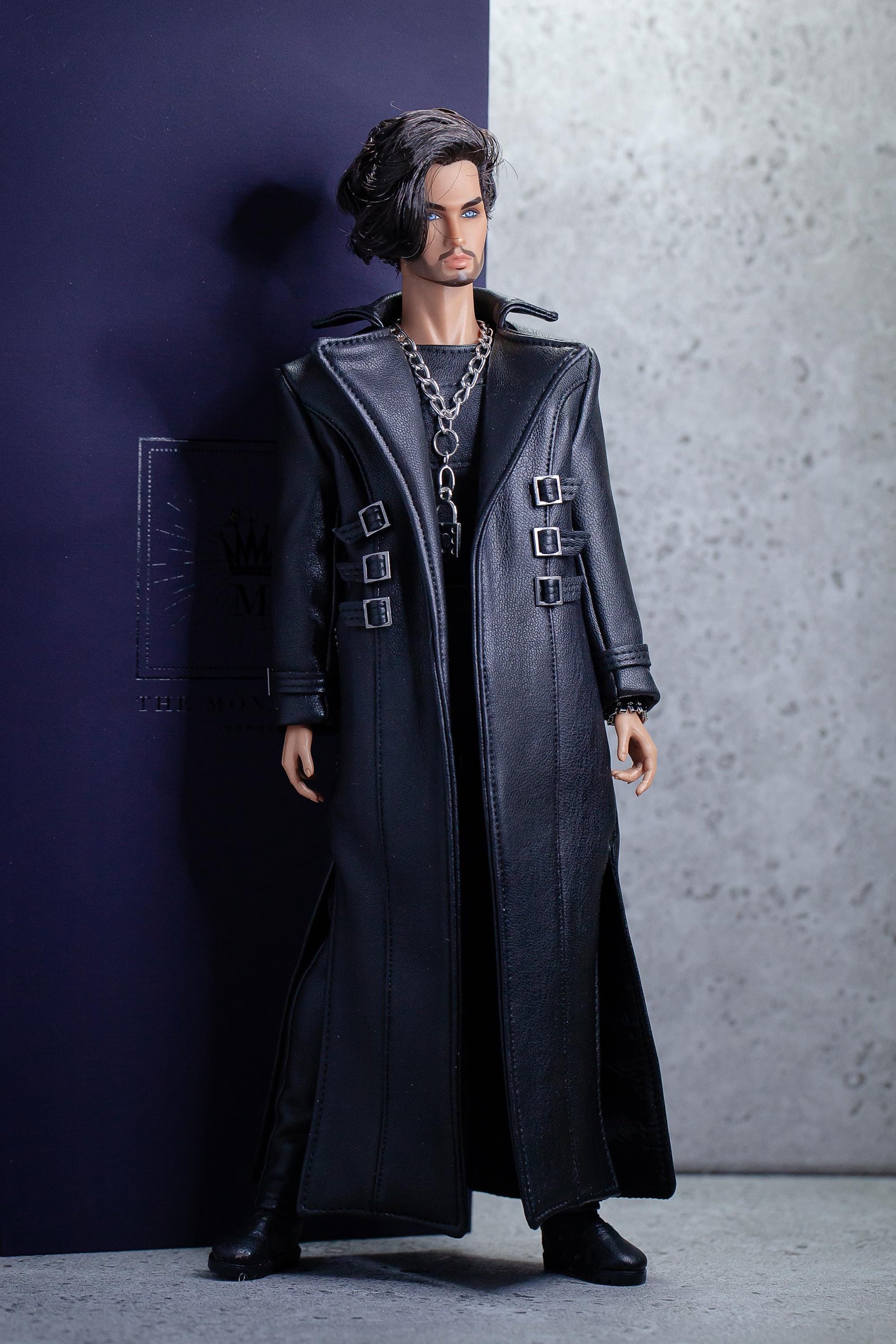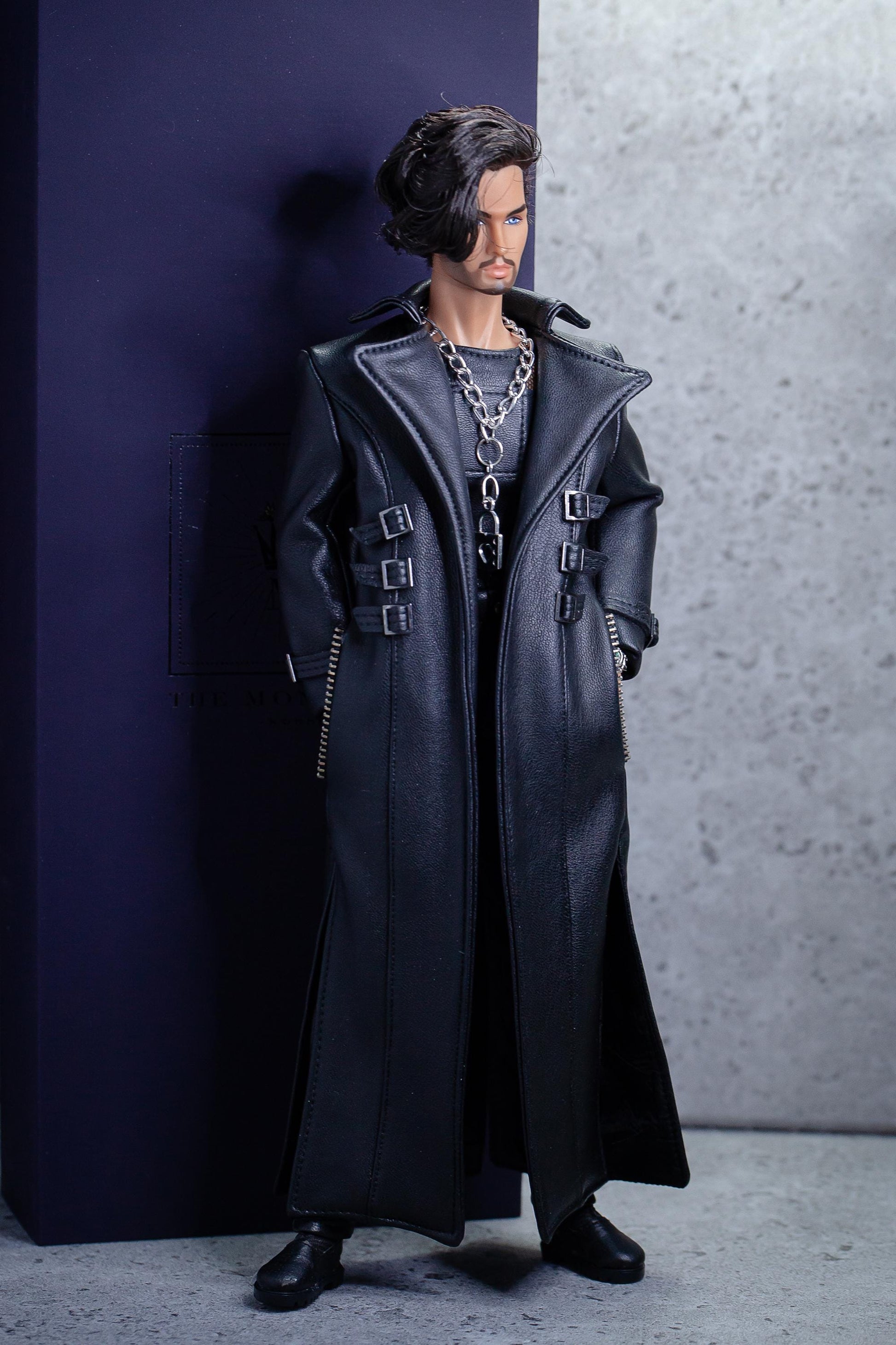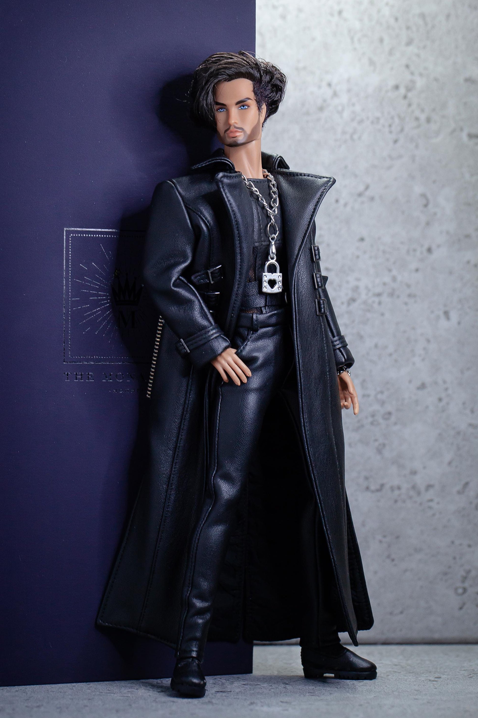 Leder Outfit für FR Homme Integrity toys fashion royalty male doll. Long trench coat.