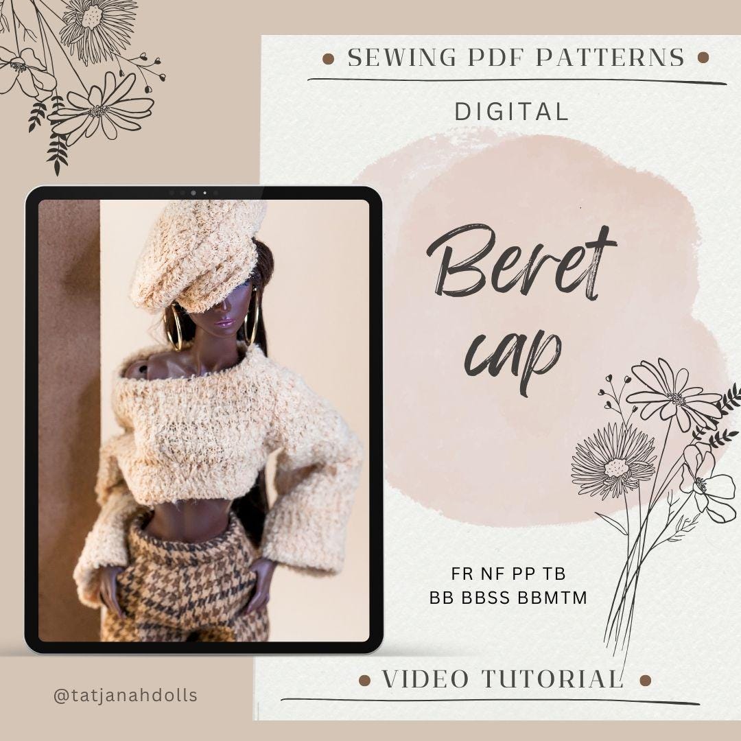 PDF Digital Pattern beret cap for Fashion Royalty Nu Face Integrity toys and BB dolls. VIDEO tutorial.