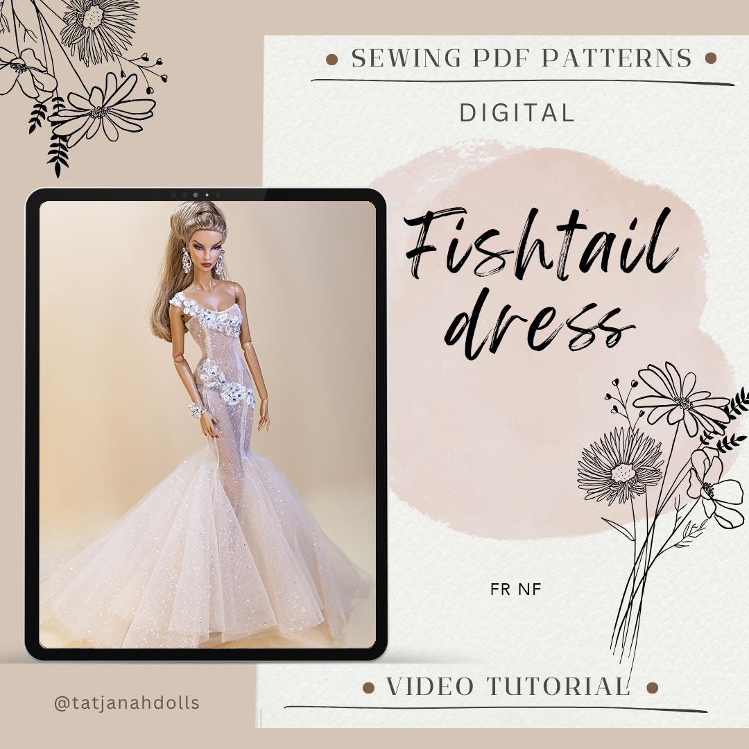 PDF Digital Pattern fishtail dress for Fashion Royalty Nu Face doll Integrity toys. VIDEO tutorial.