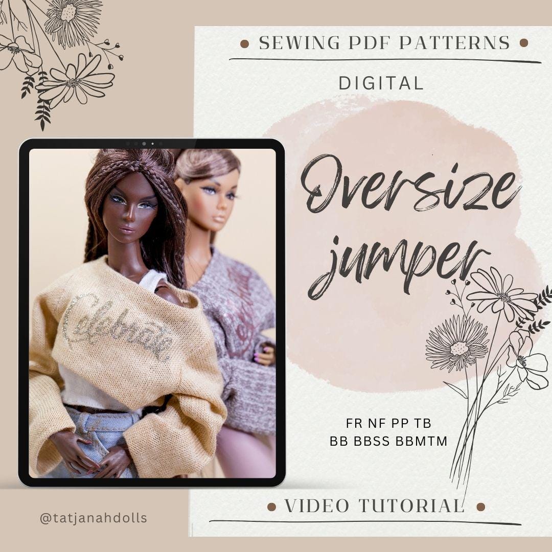 PDF Digital Pattern oversize jumper pullover for Fashion Royalty Nu Face Integrity toys and BB dolls. VIDEO tutorial.