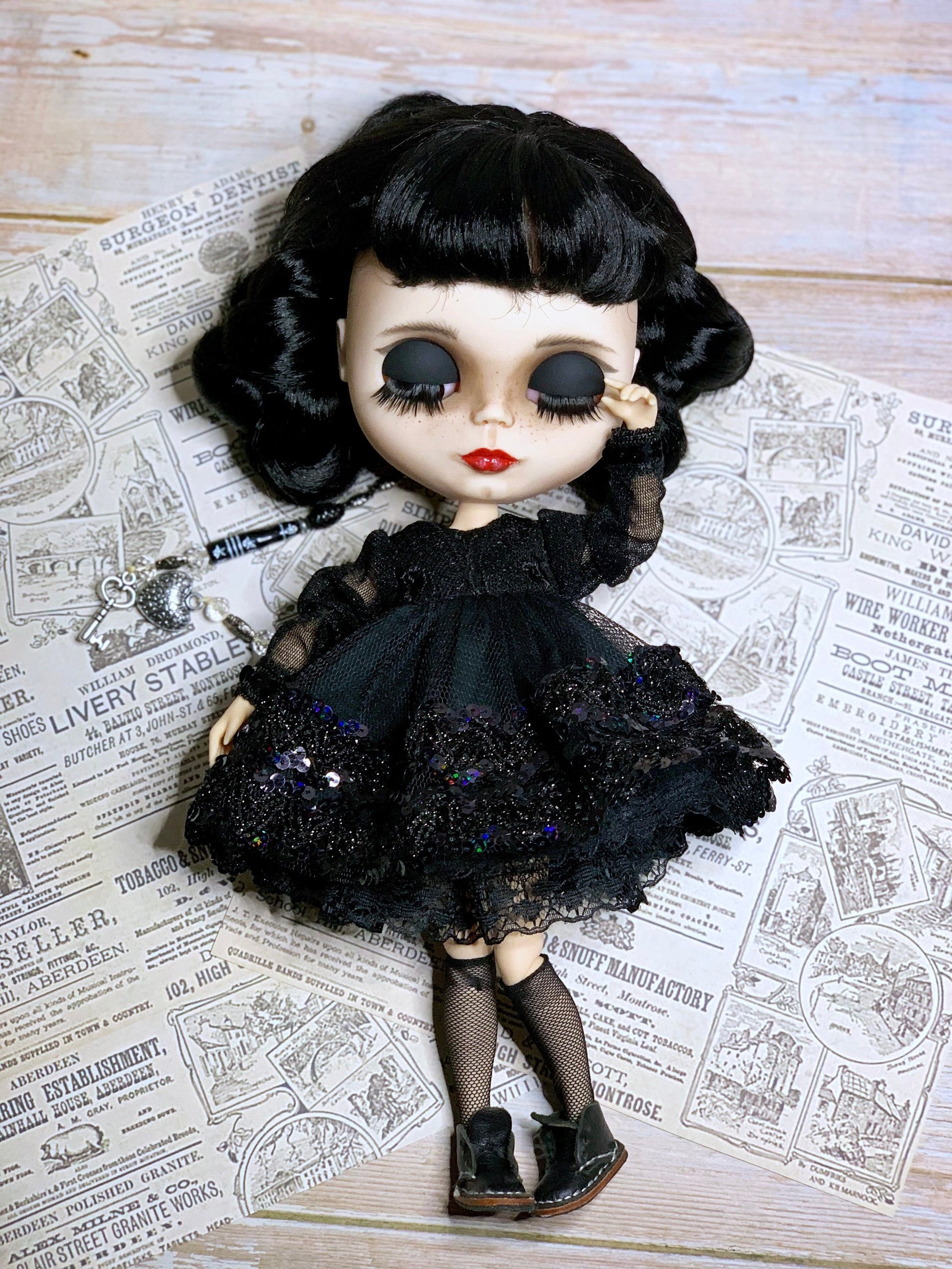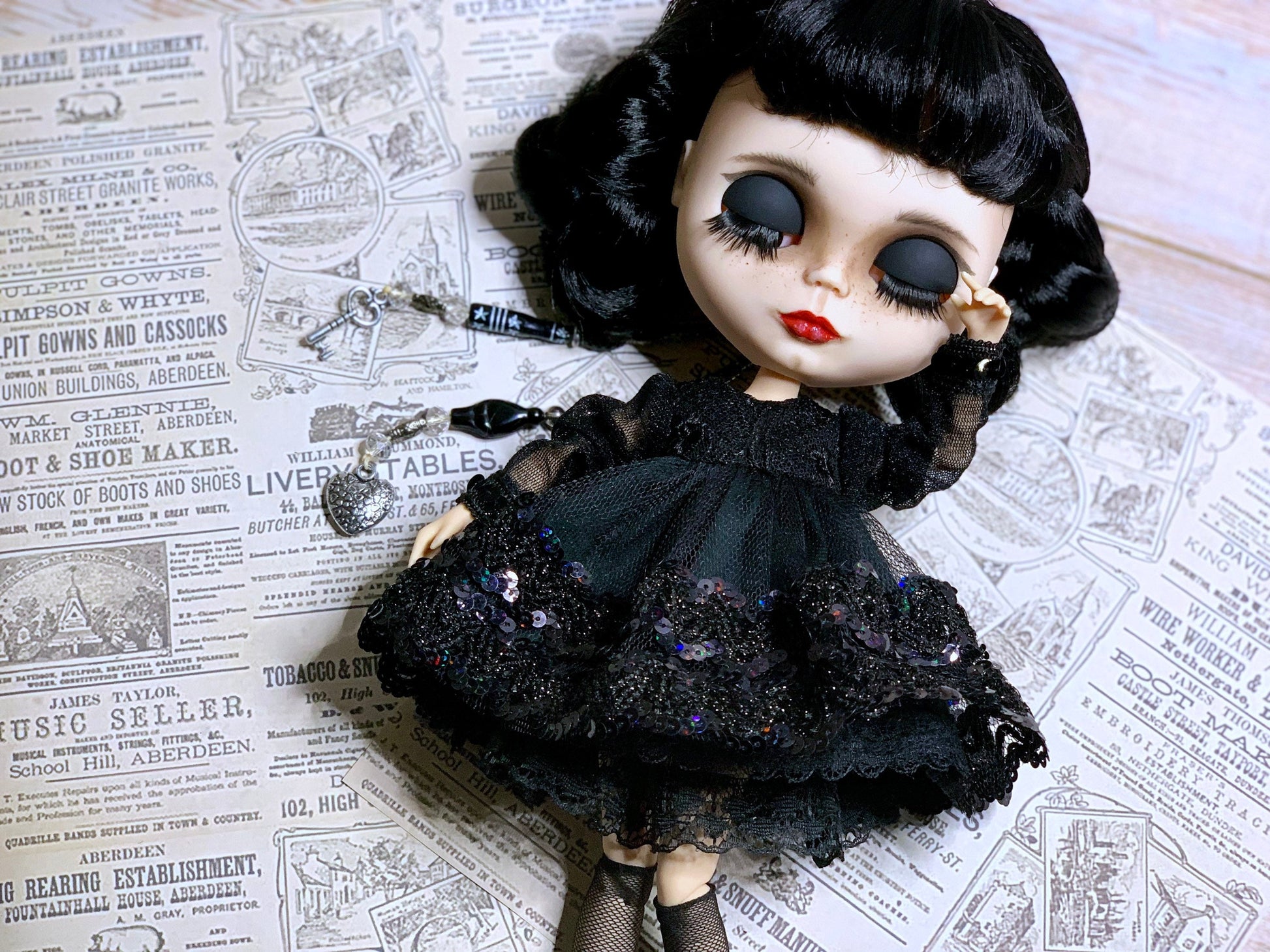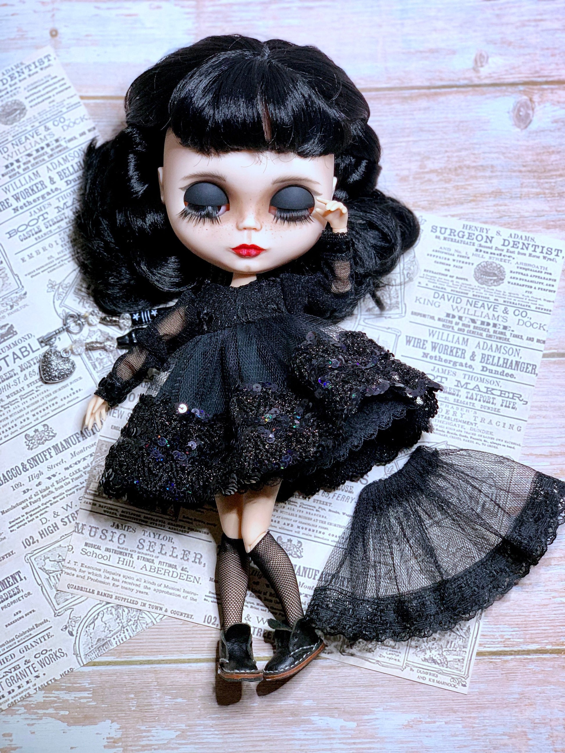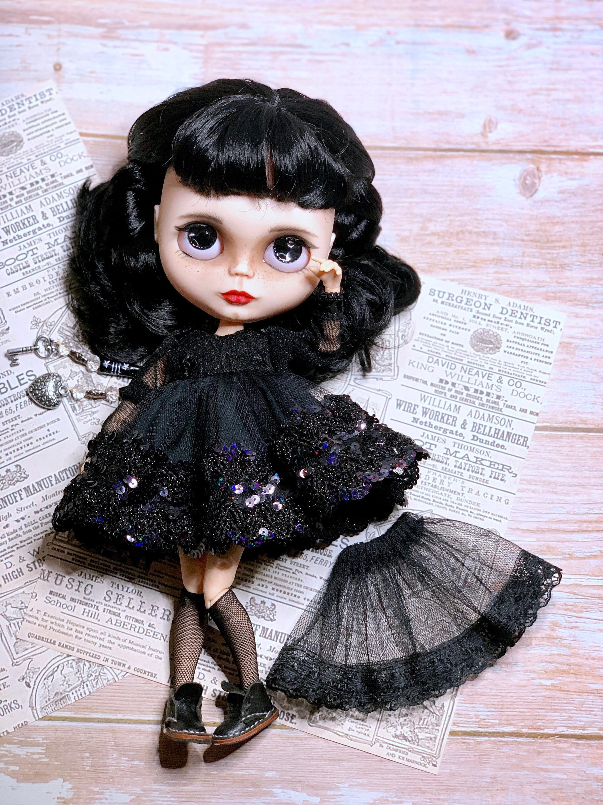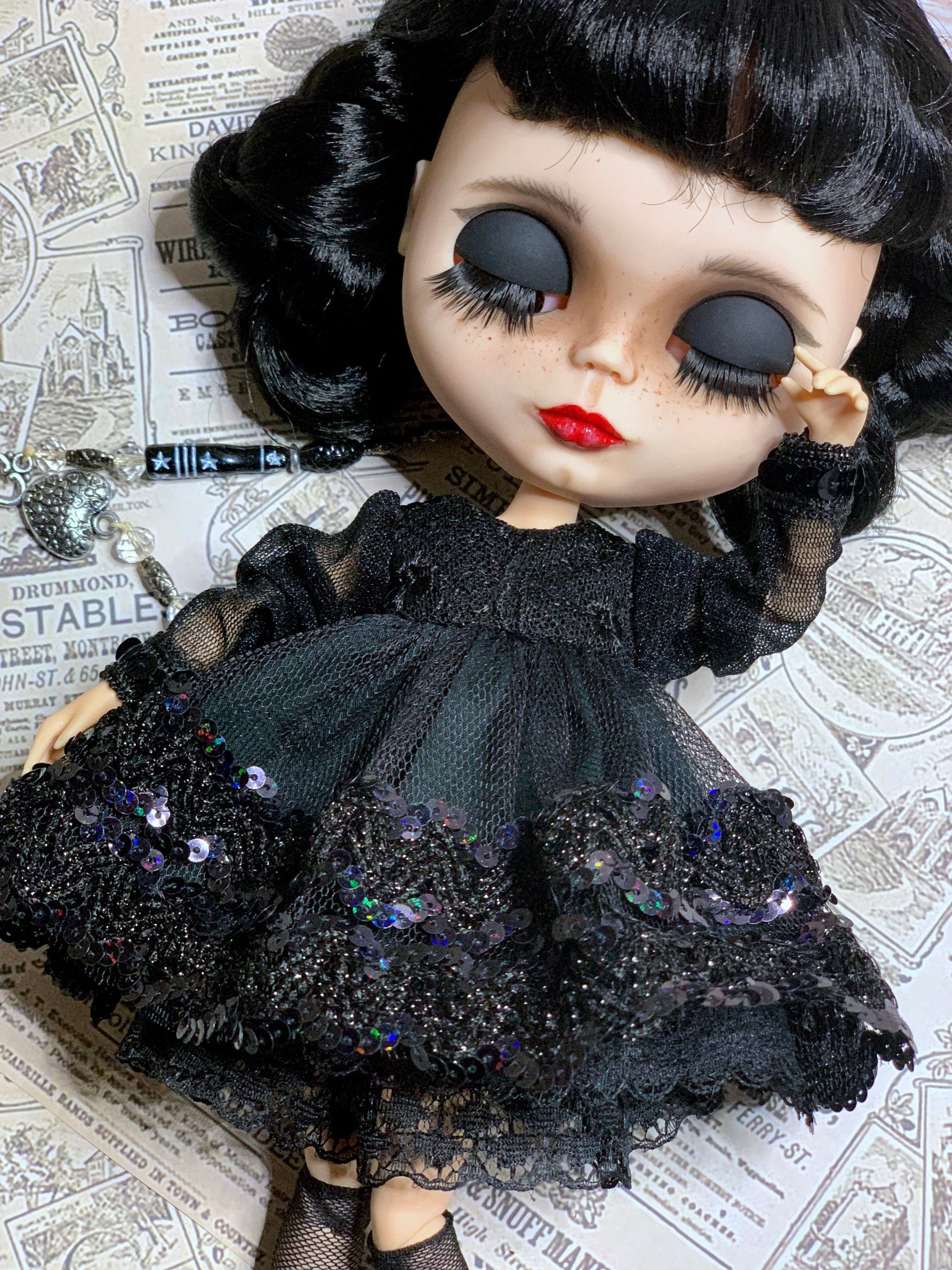 Ein edles mit Pailletten besticktes schwarzes Kleid aus Spitze, Ballkleid von Wednesday für Blythe Puppe ( passend auch für Pulipp und ähnliche Puppenkörper).