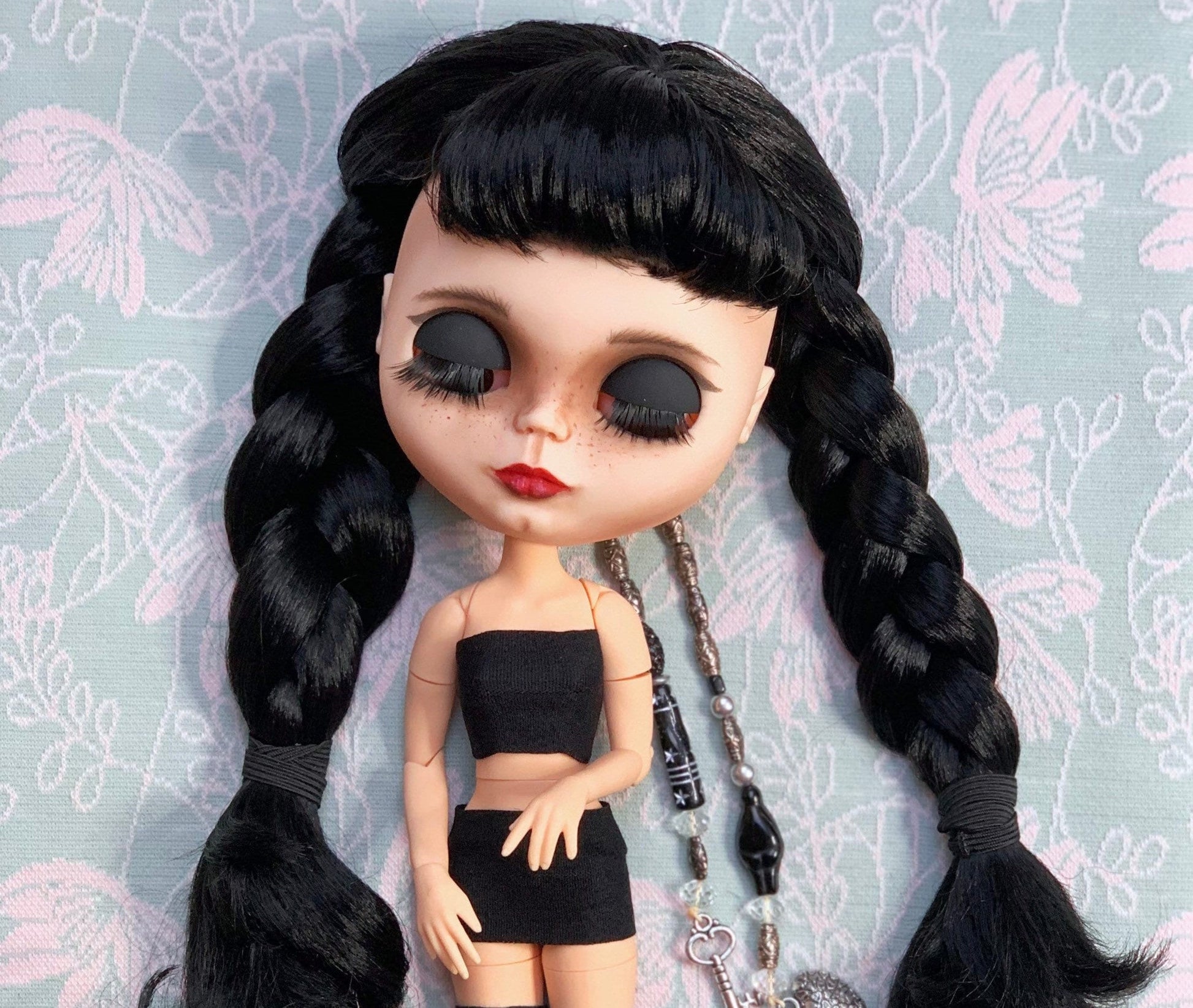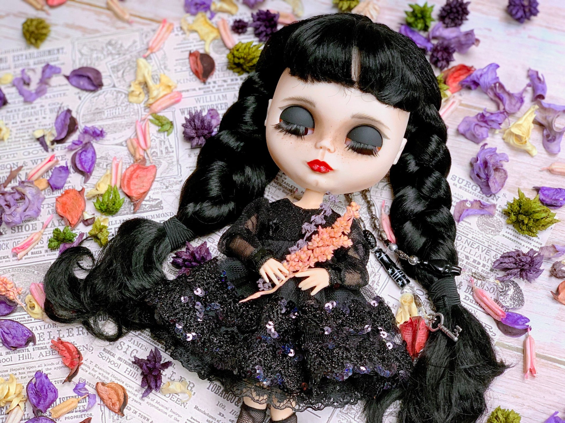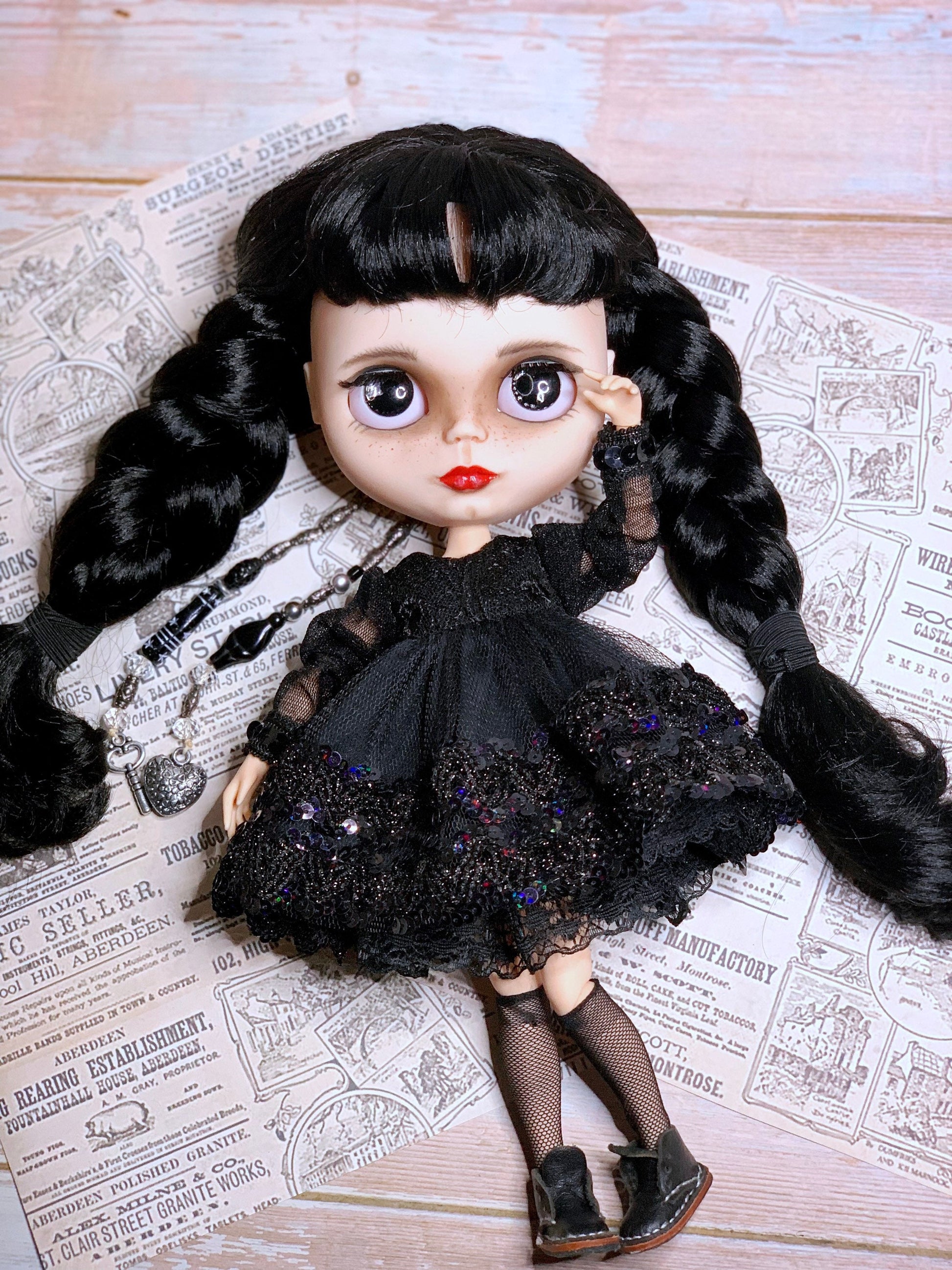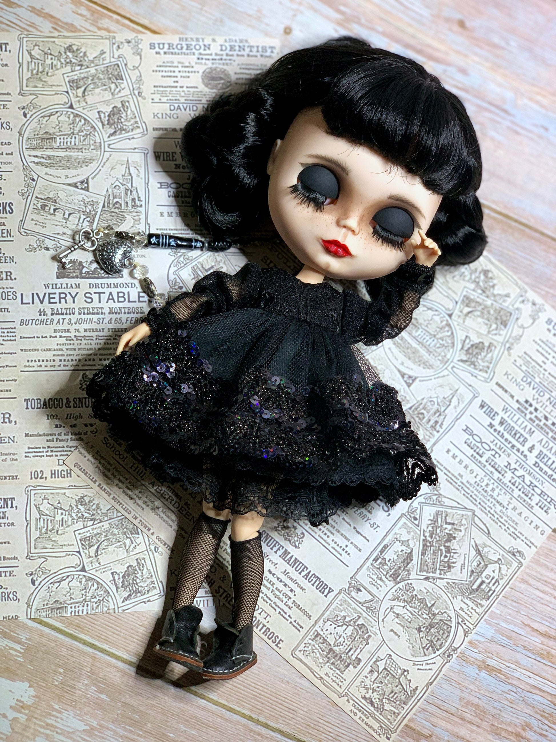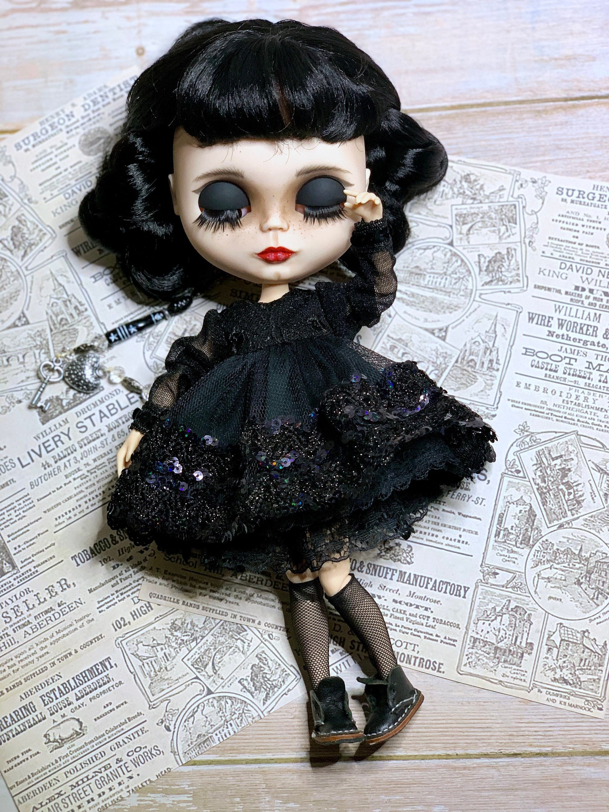 Ein edles mit Pailletten besticktes schwarzes Kleid aus Spitze, Ballkleid von Wednesday für Blythe Puppe ( passend auch für Pulipp und ähnliche Puppenkörper).