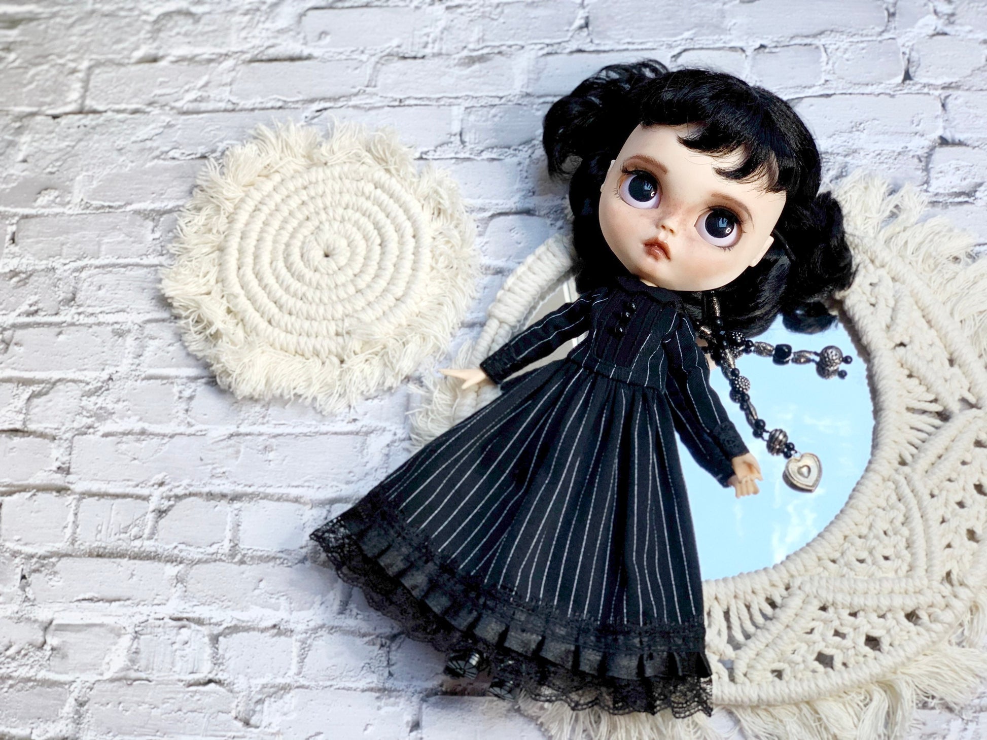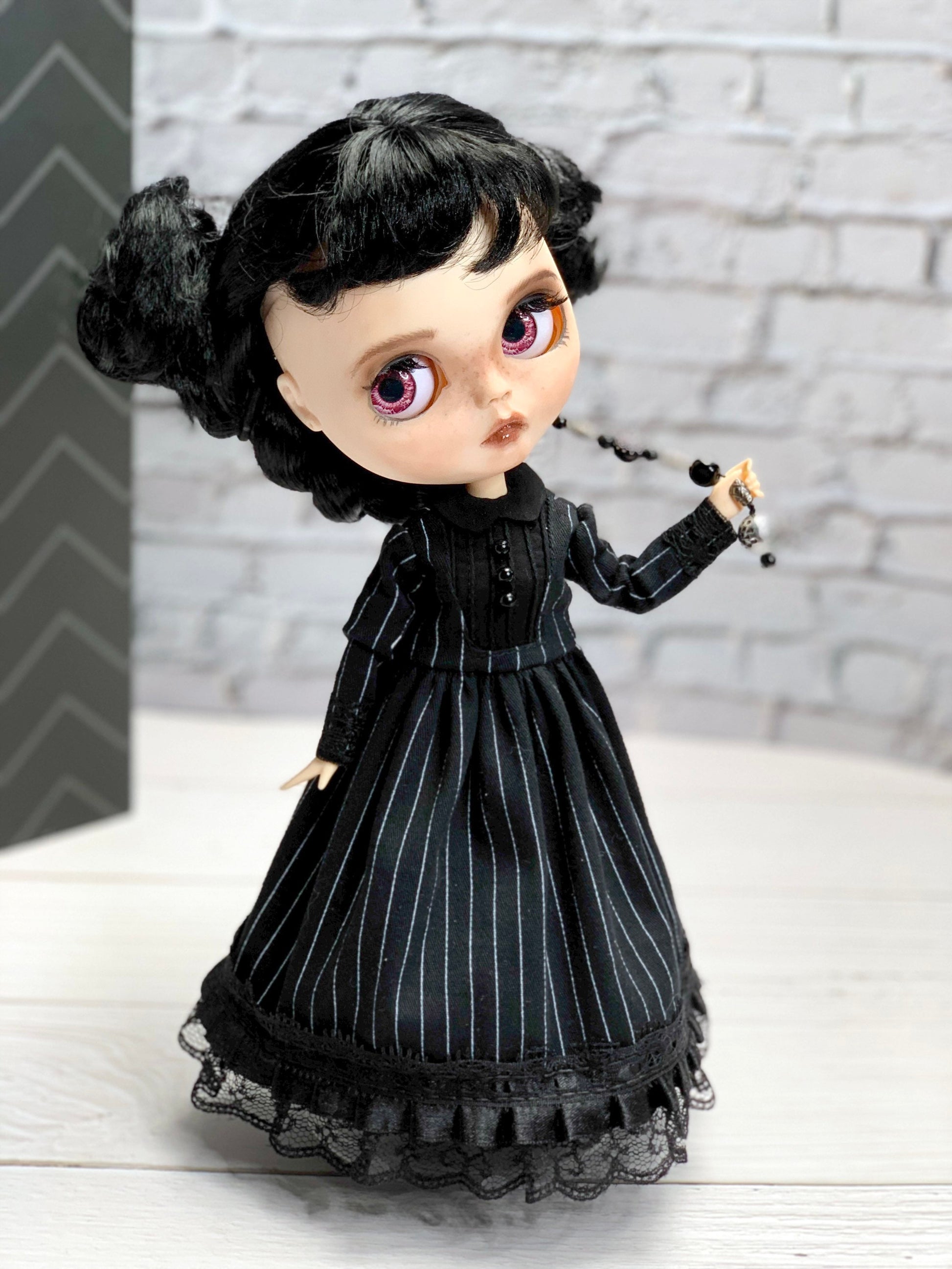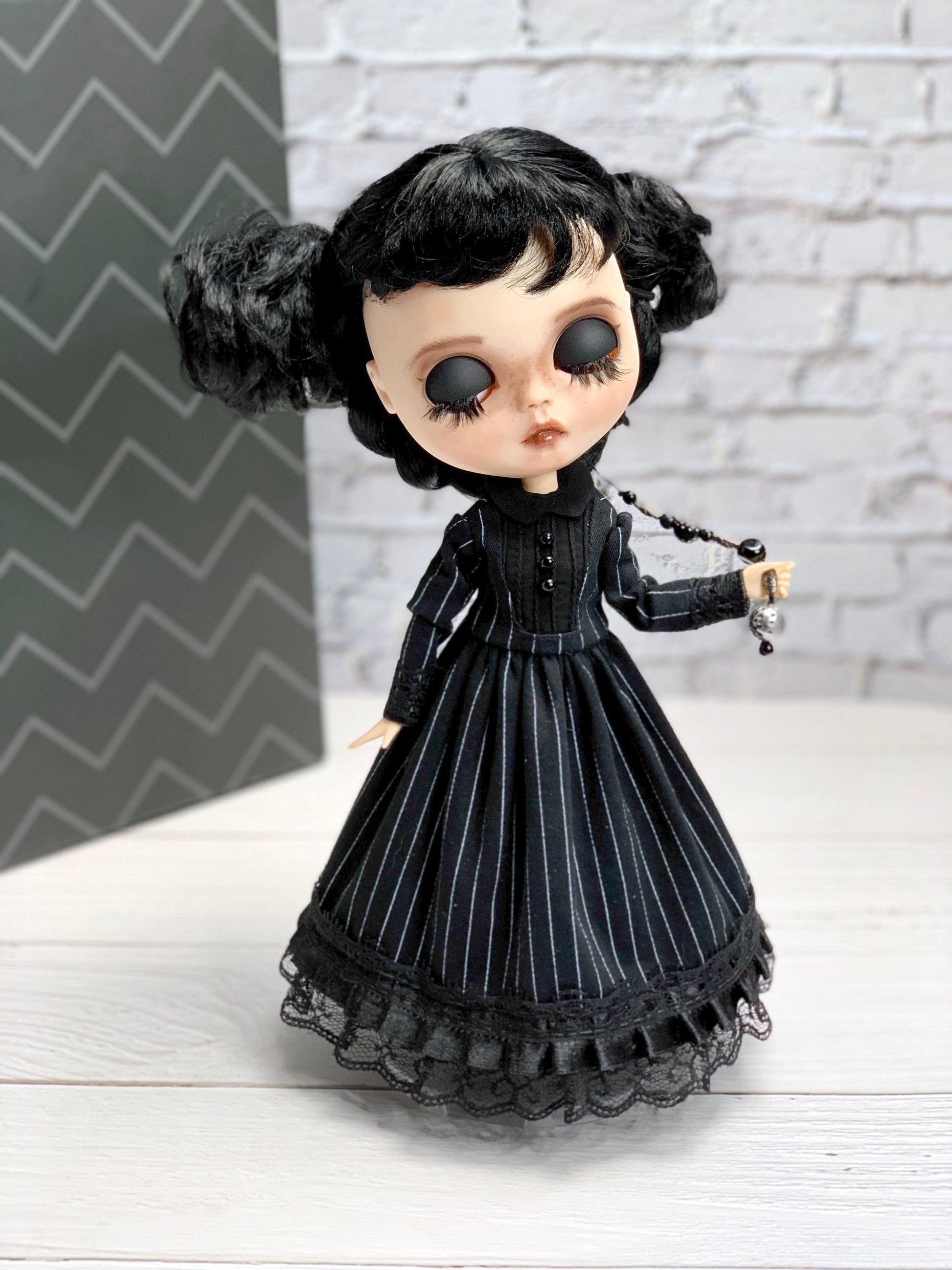 Ein edles schwarzes Kleid mit Nadelstreifen und Spitzenrüsche , Ballkleid mit Kragen von Wednesday für Blythe Puppe ( passend auch für Pulipp und ähnliche Puppenkörper).