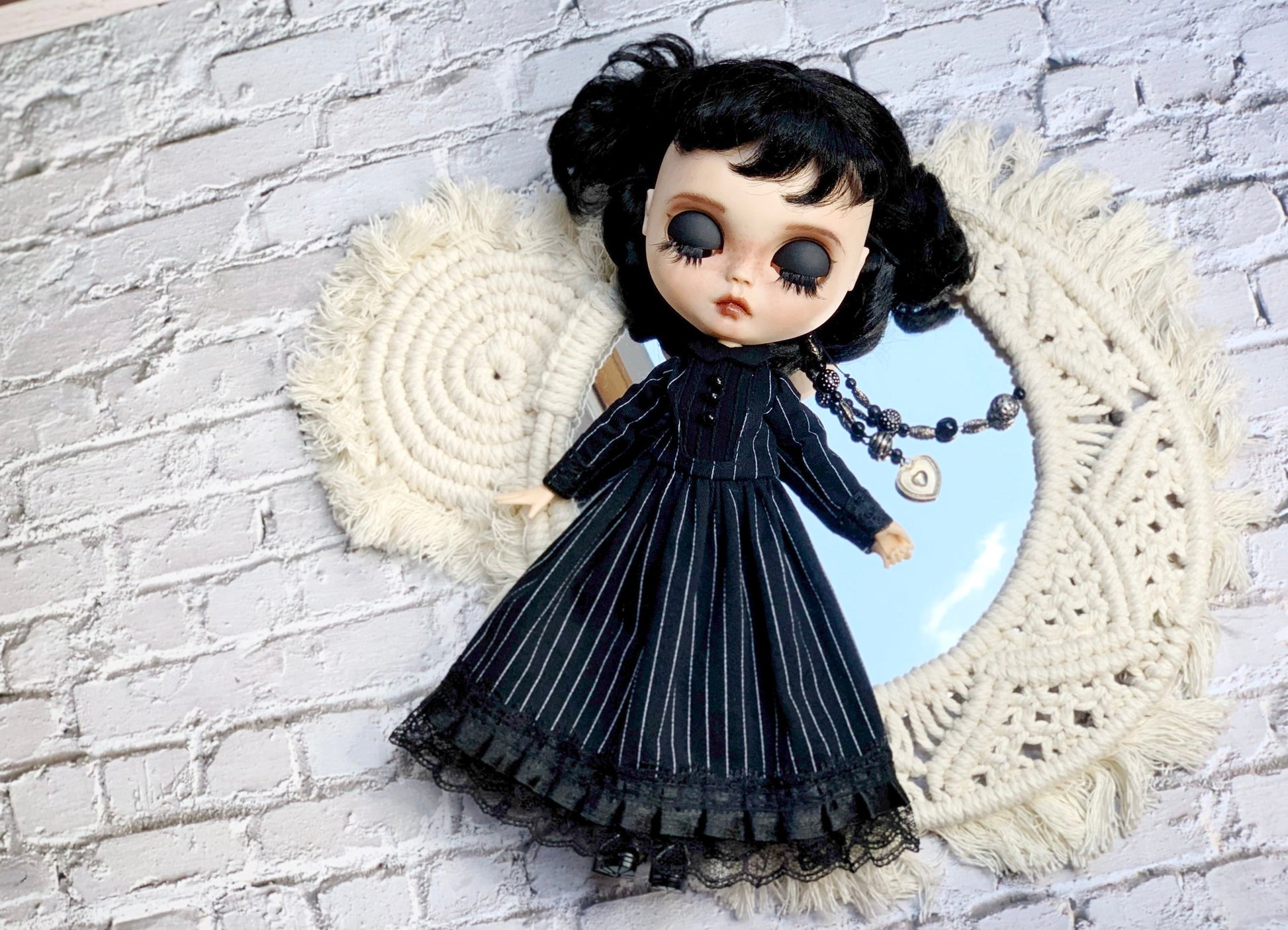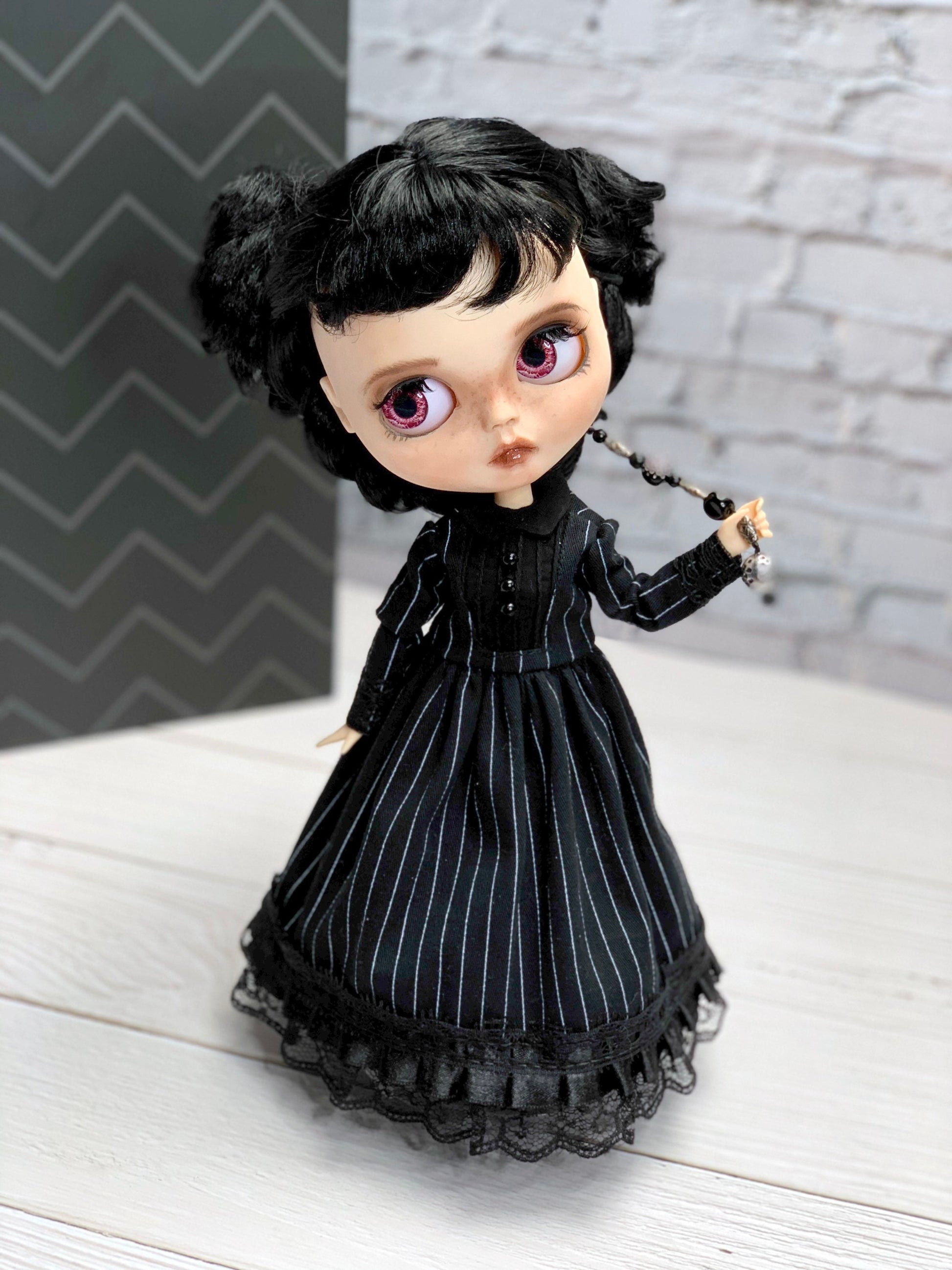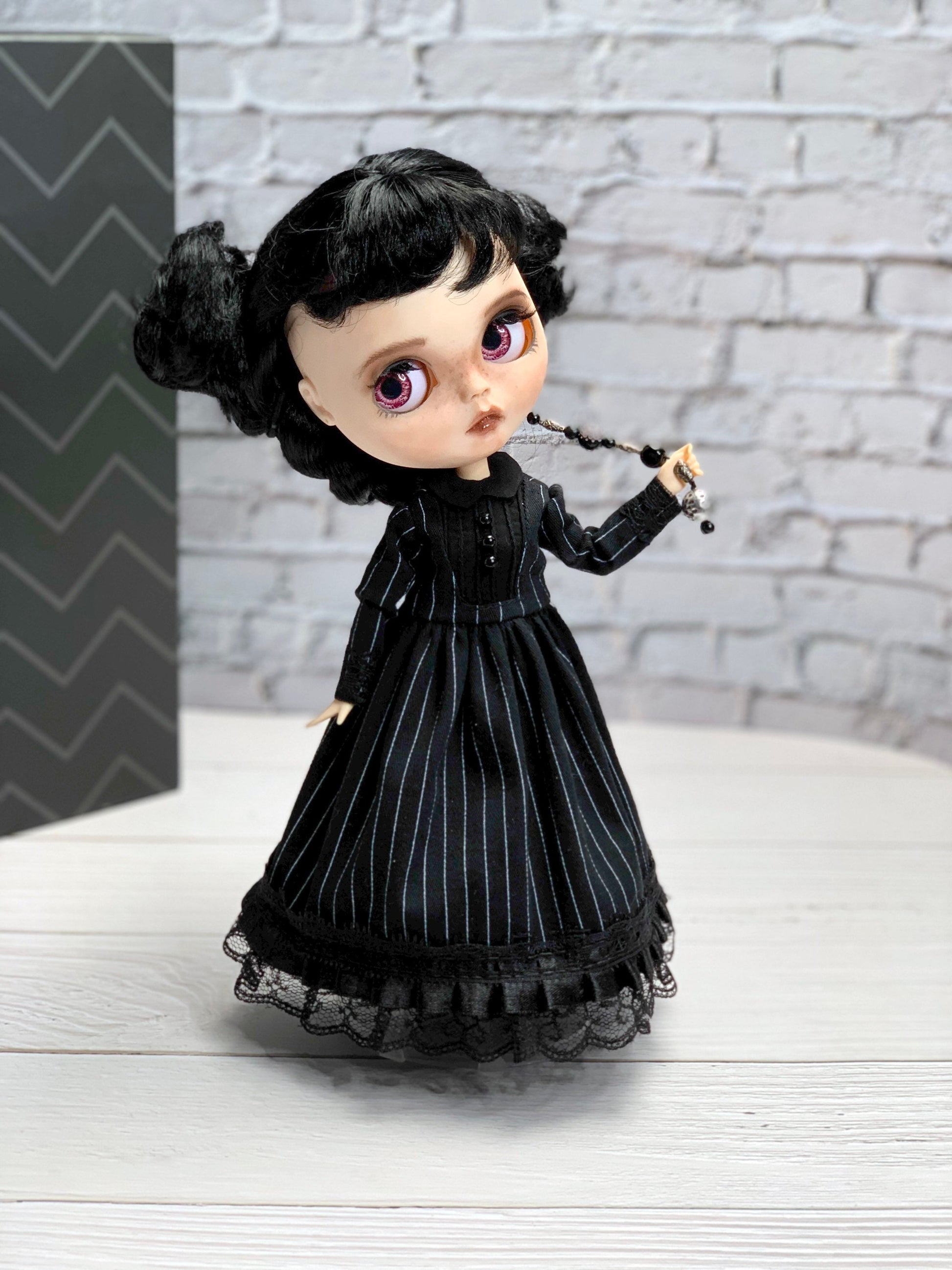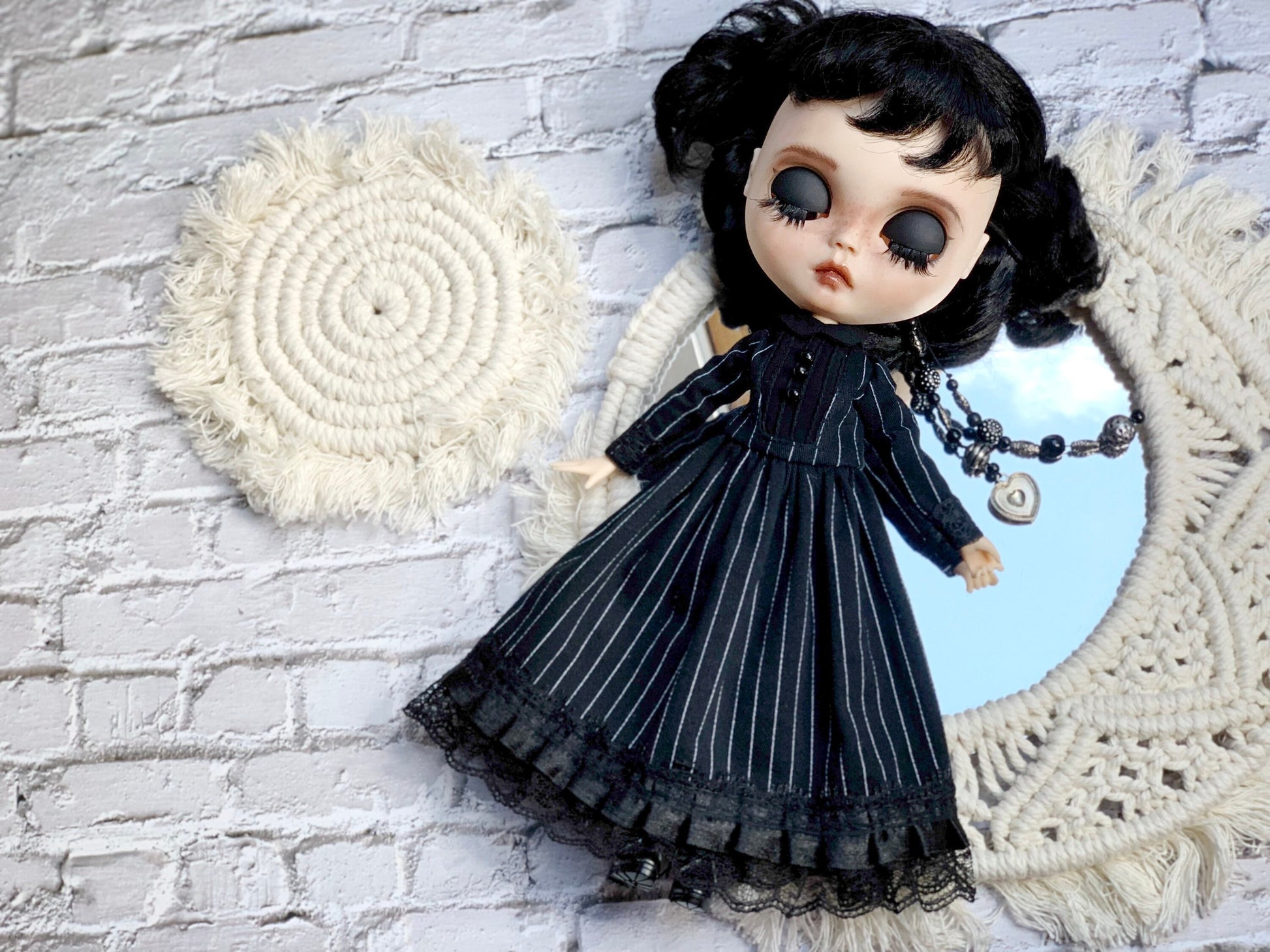 Ein edles schwarzes Kleid mit Nadelstreifen und Spitzenrüsche , Ballkleid mit Kragen von Wednesday für Blythe Puppe ( passend auch für Pulipp und ähnliche Puppenkörper).