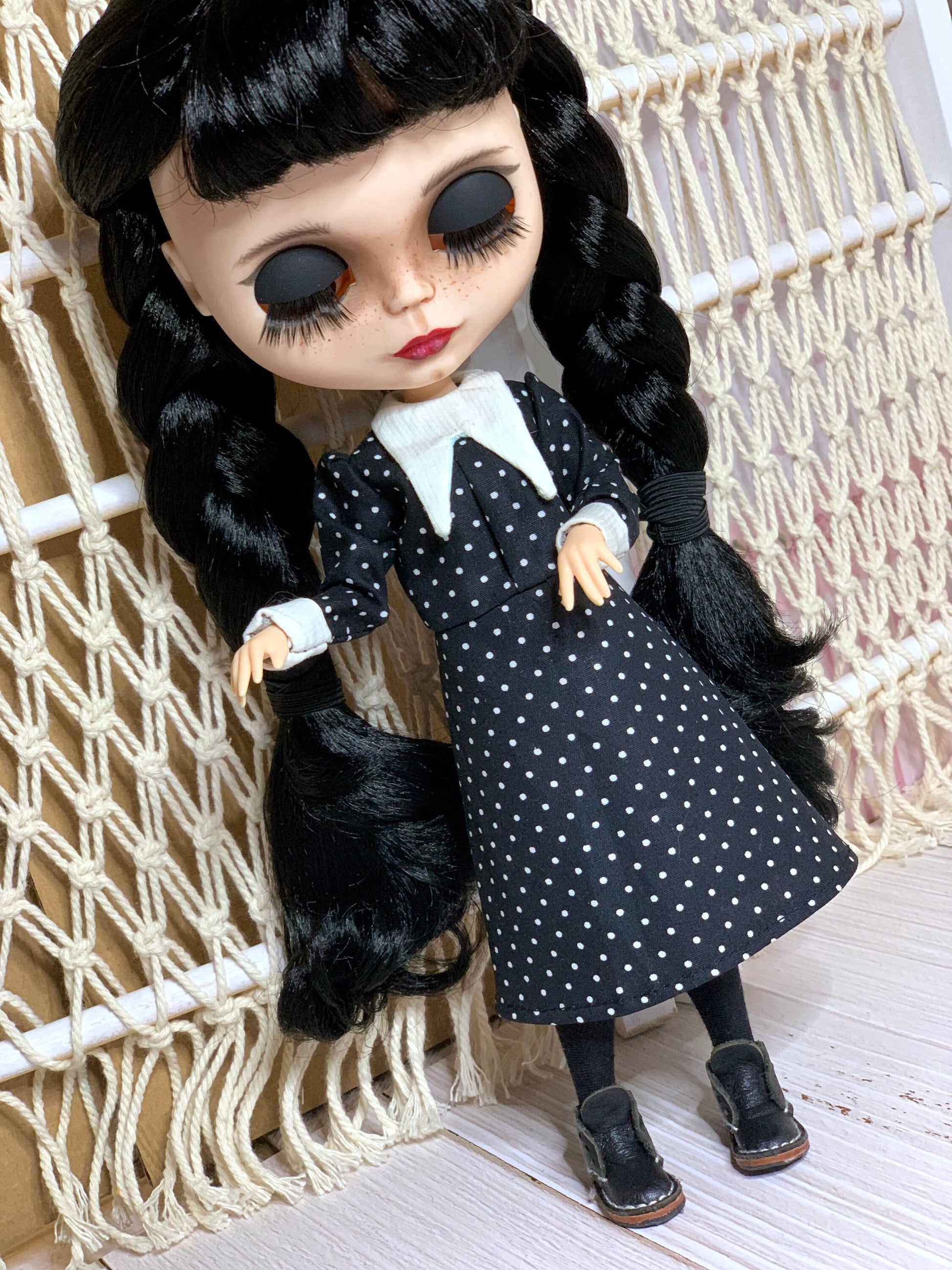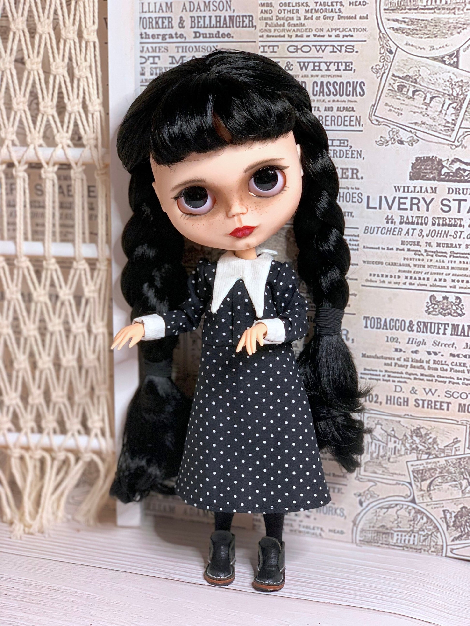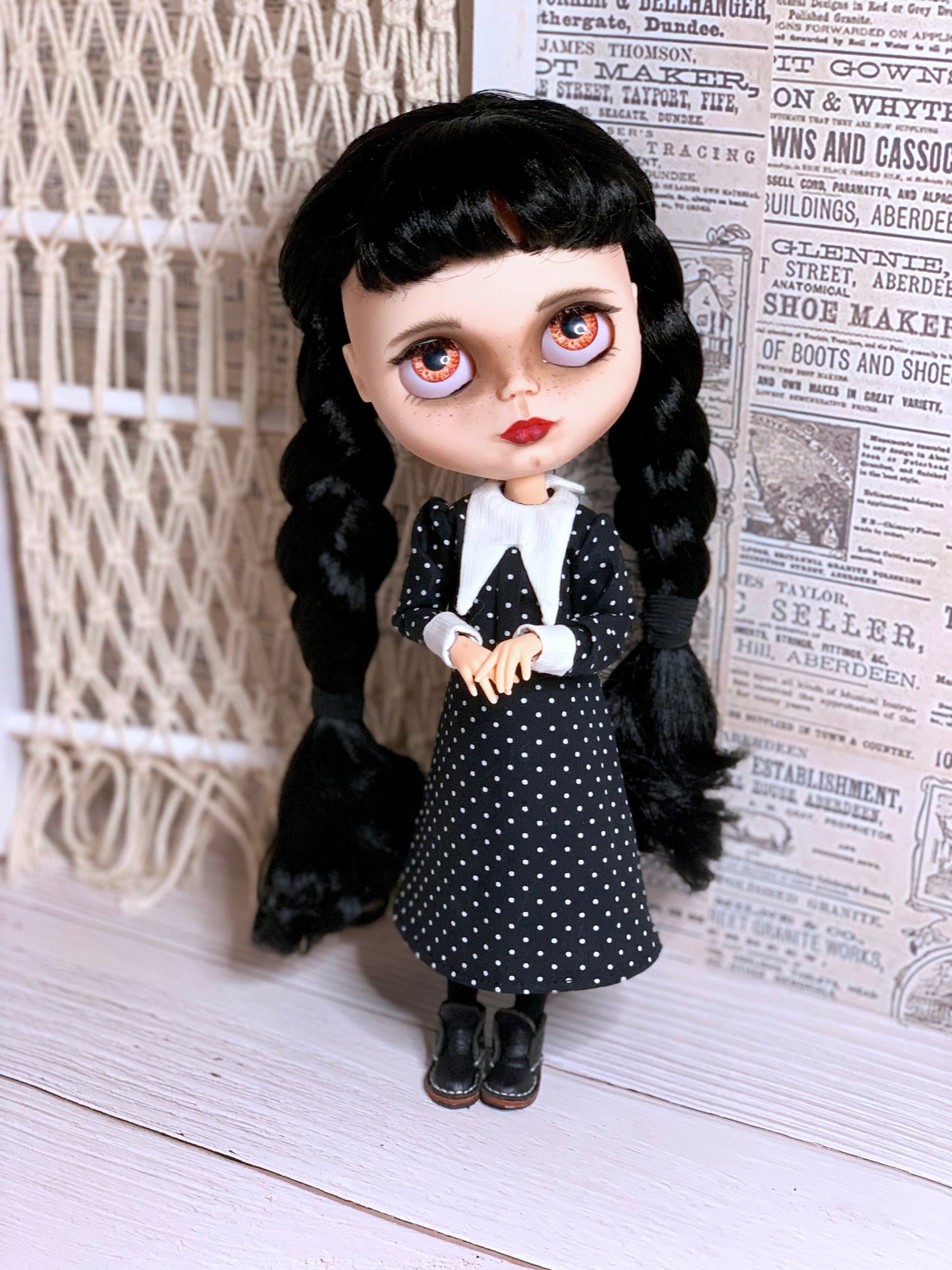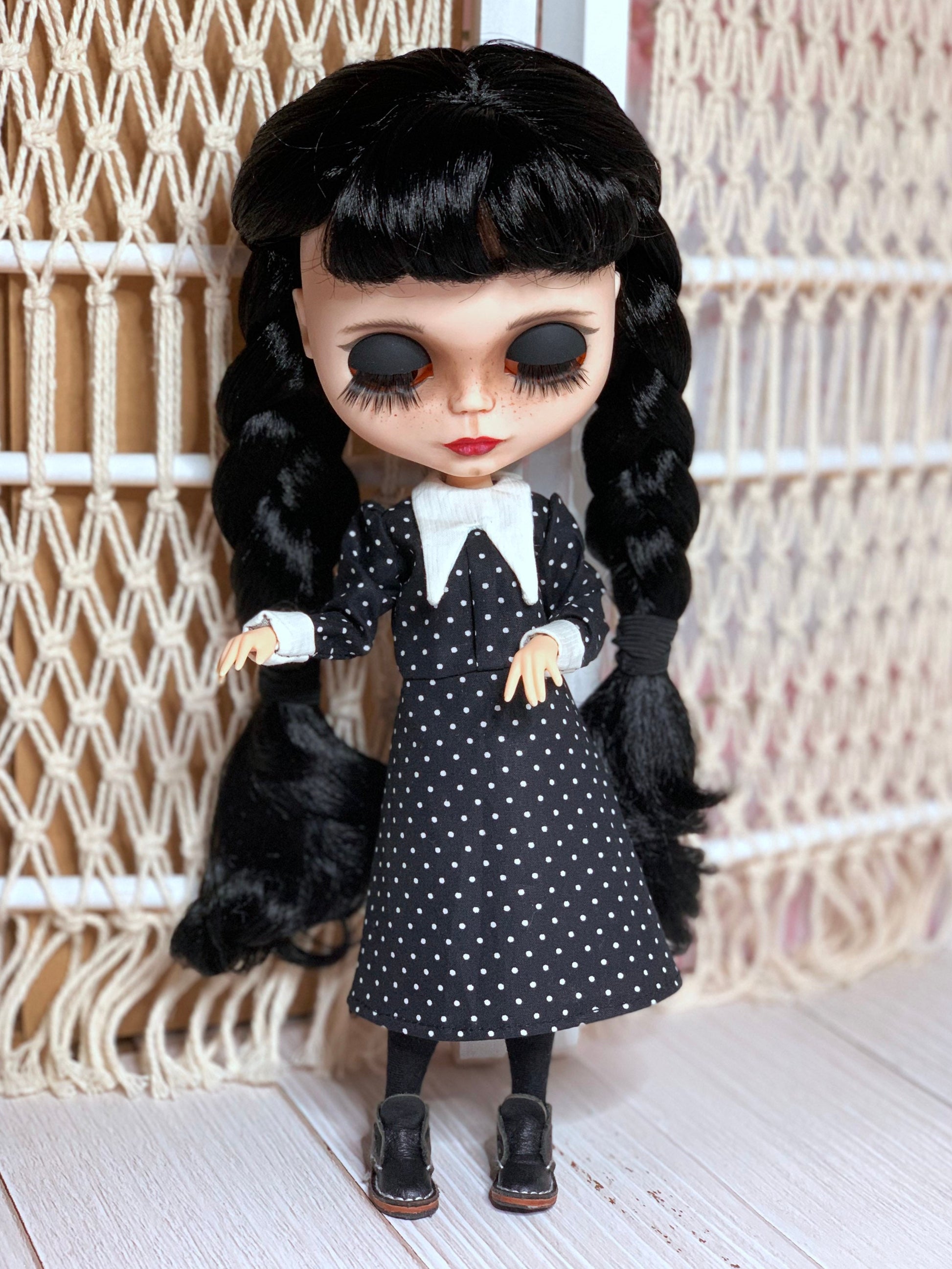Ein edles klassisches schwarzes Kleid im strengen Stil von Wednesday für Blythe Puppe ( passend auch für Pulipp und ähnliche Puppenkörper).