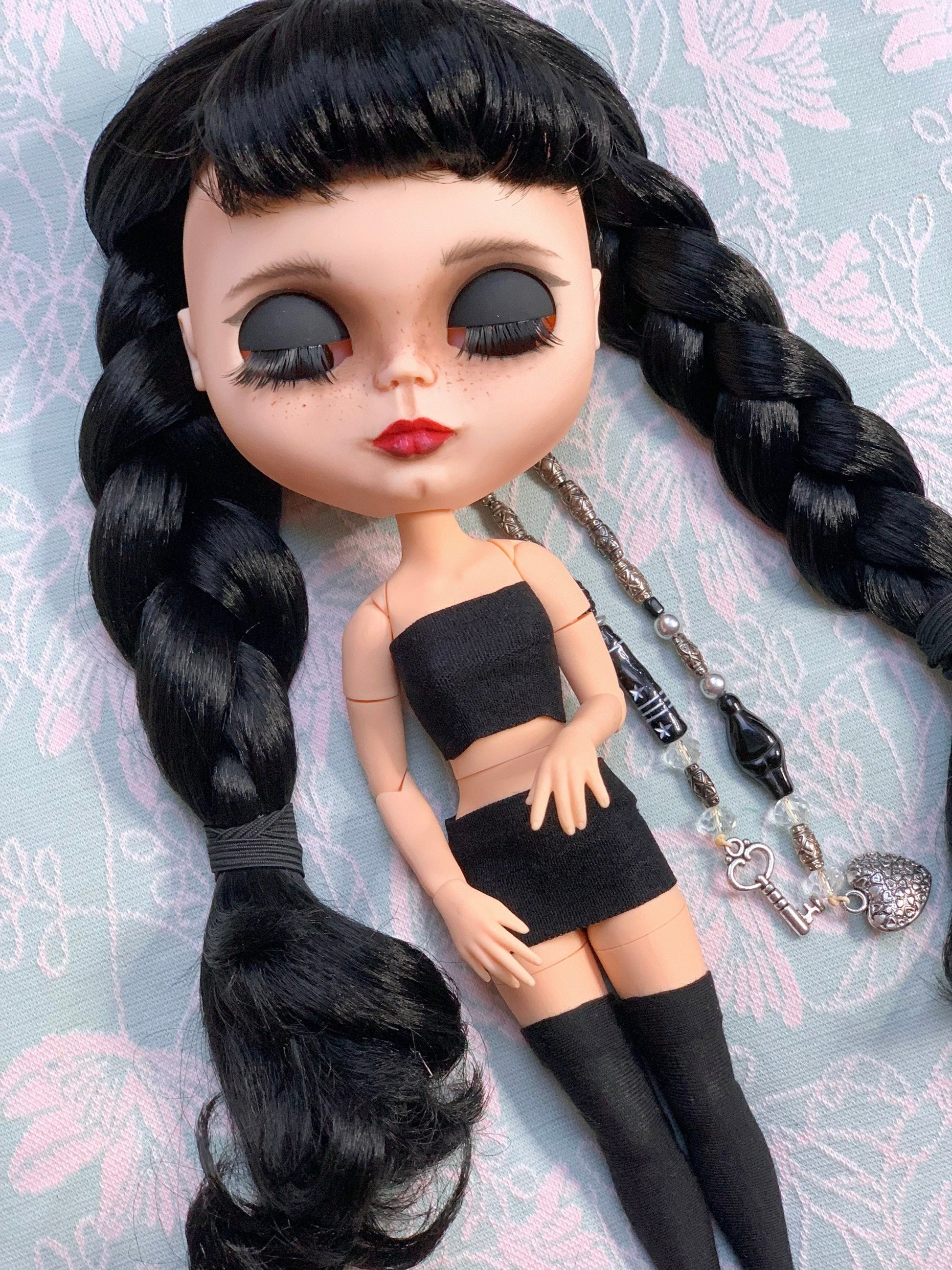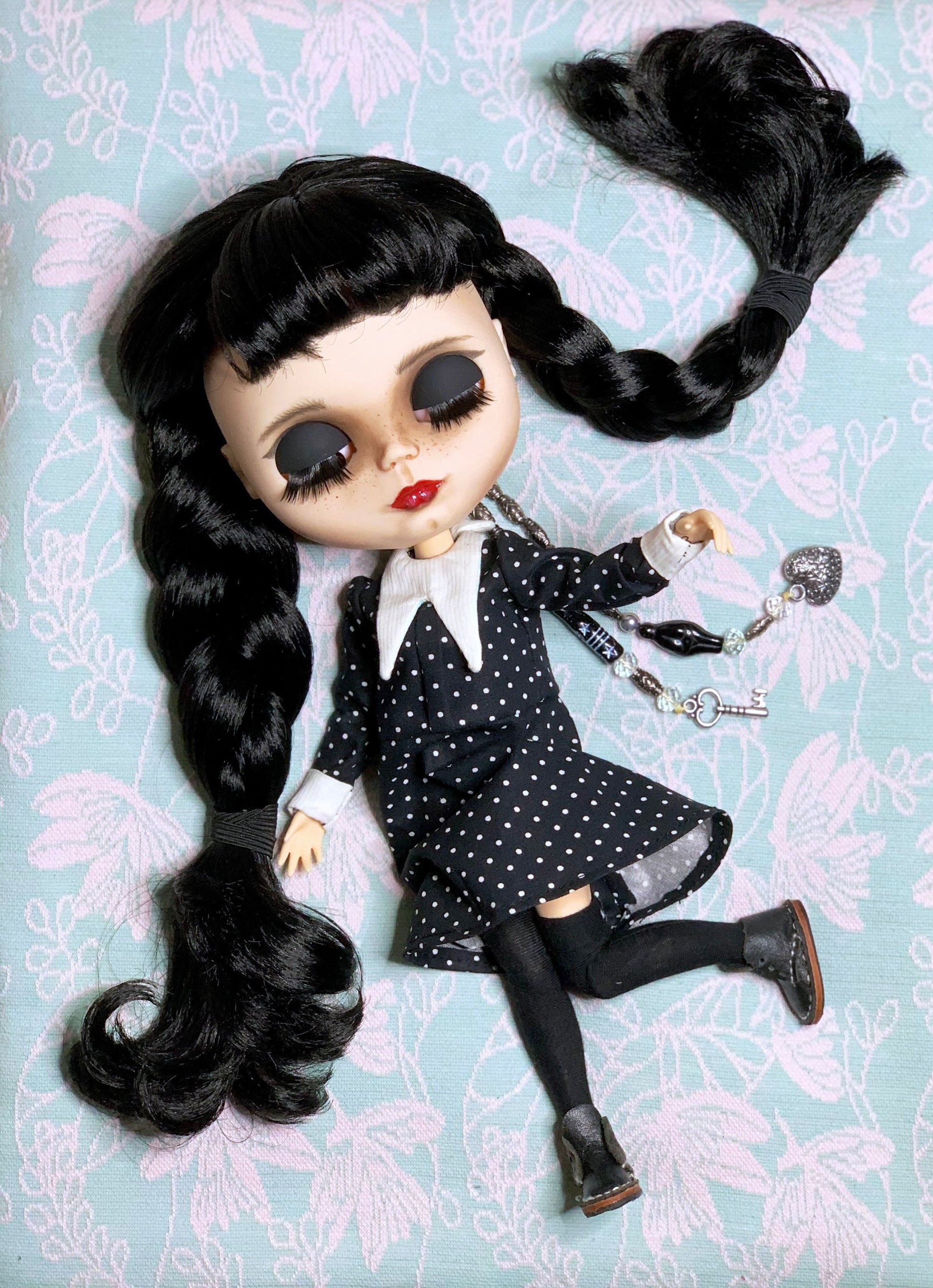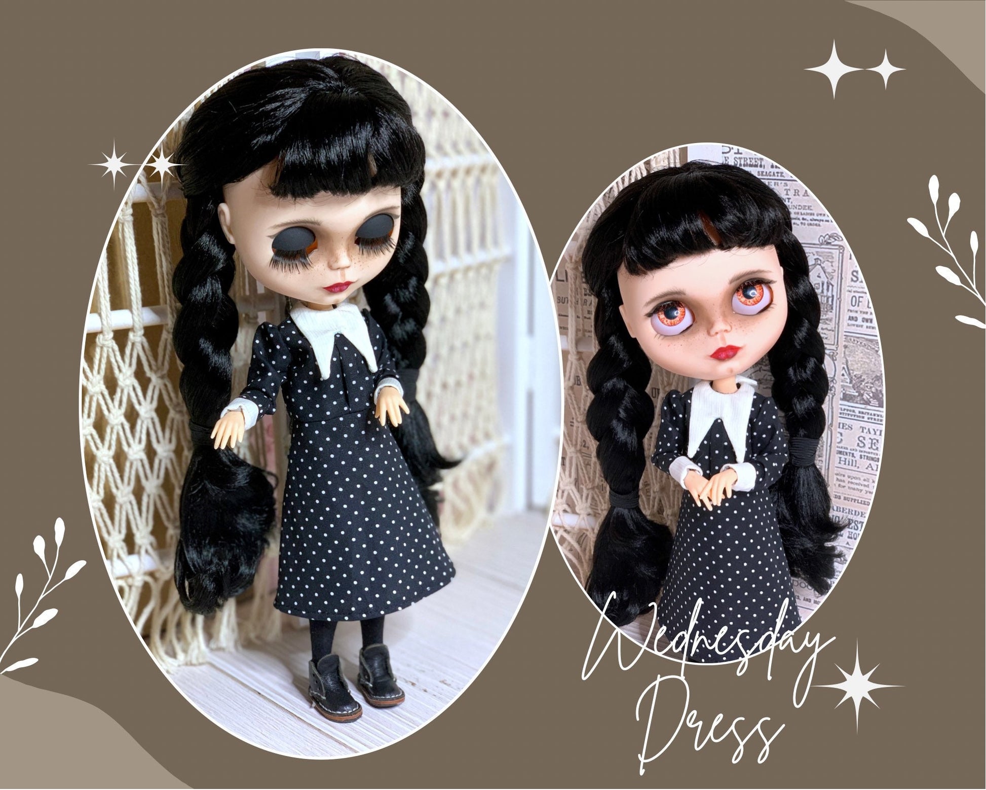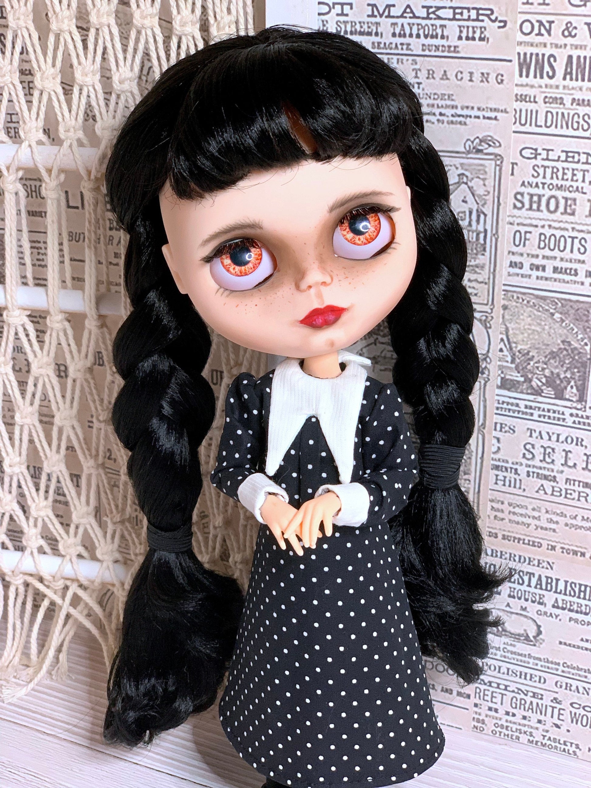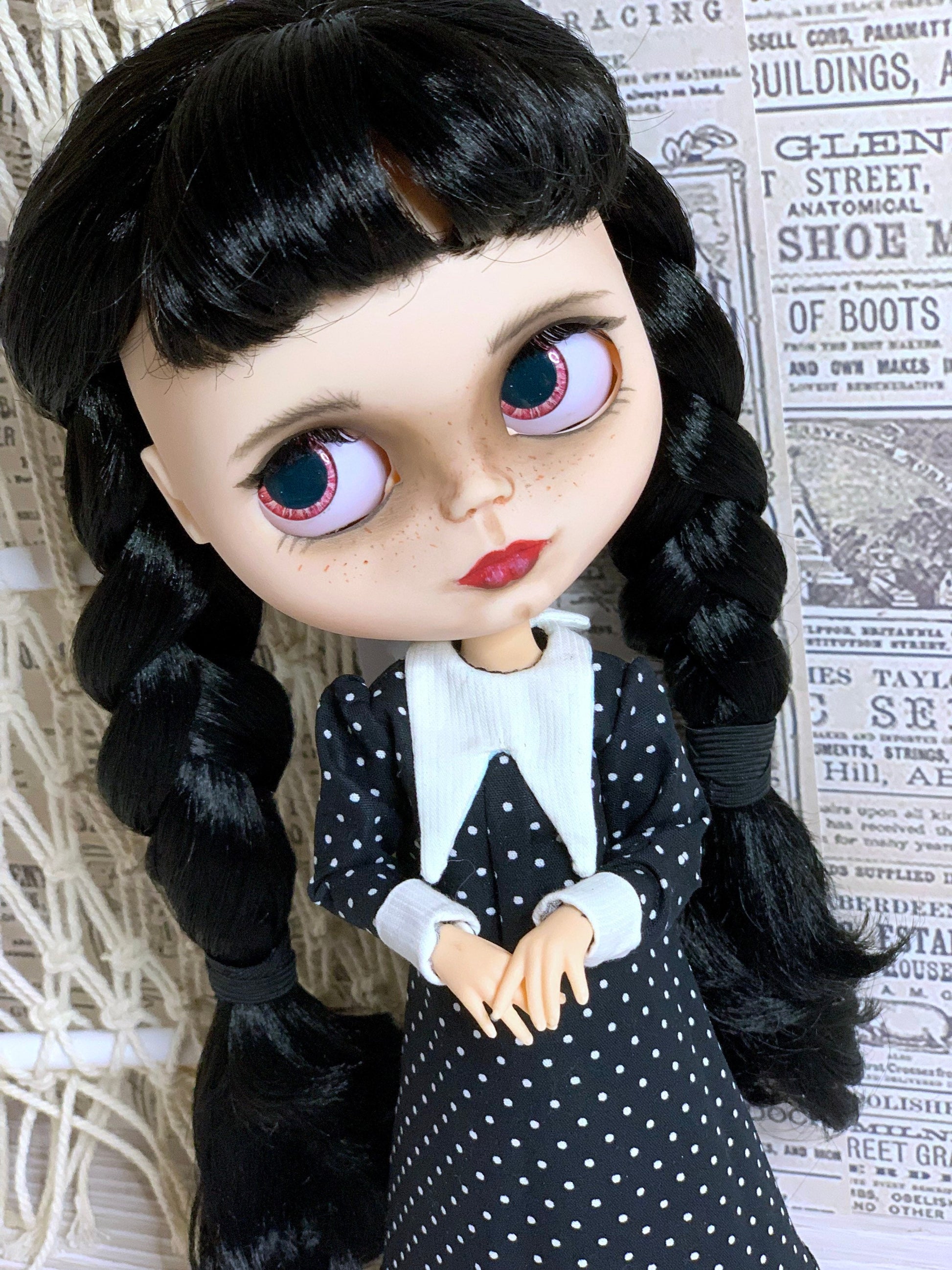 Ein edles klassisches schwarzes Kleid im strengen Stil von Wednesday für Blythe Puppe ( passend auch für Pulipp und ähnliche Puppenkörper).